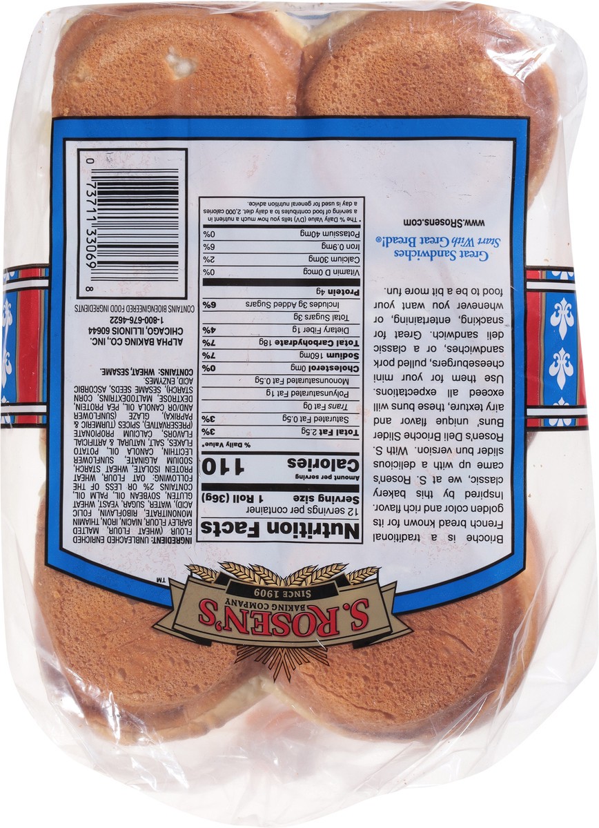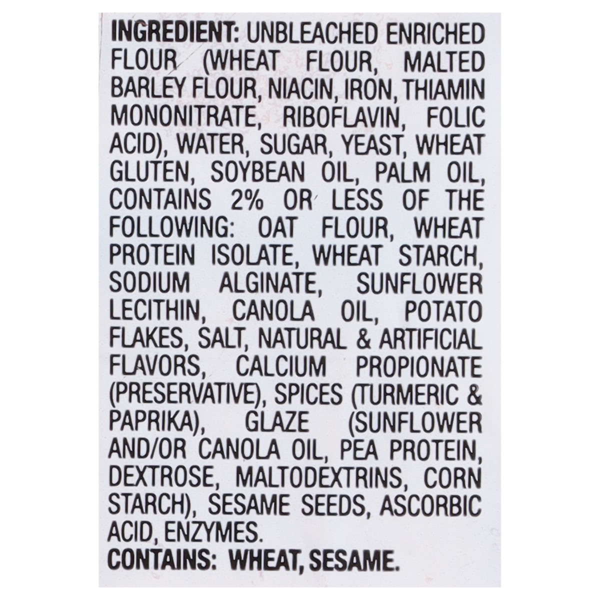 Unbleached Enriched Flour (Wheat Flour, Malted Barley Flour, Niacin, Iron, Thiamin Mononitrate, Riboflavin, Folic Acid), Water, Sugar, Yeast, Wheat Gluten, Soybean Oil, Palm Oil, Contains 2% or Less o…
