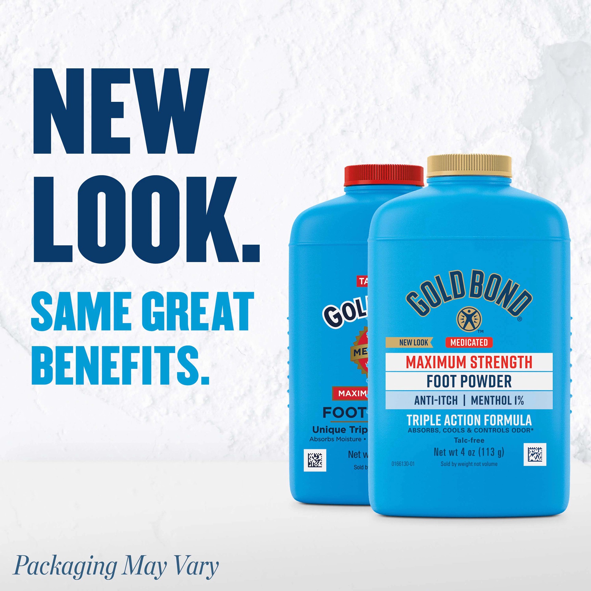 New look. Anti-itch. Menthol 1%. Triple action formula. Absorbs, cools & controls odor (Absorbs odor-causing sweat.). Talc free. Sold by weight not volume. This stuff works!
