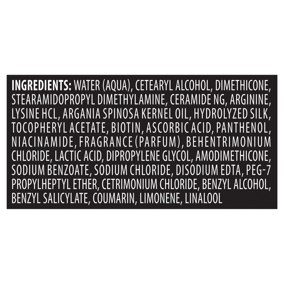 Water (Aqua), Cetearyl Alcohol, Dimethicone, Stearamidopropyl Dimethylamine, Ceramide Ng, Arginine, Lysine HCl, Argania Spinosa Kernel Oil, Hydrolyzed Silk, Tocopheryl Acetate, Biotin, Ascorbic Acid, …