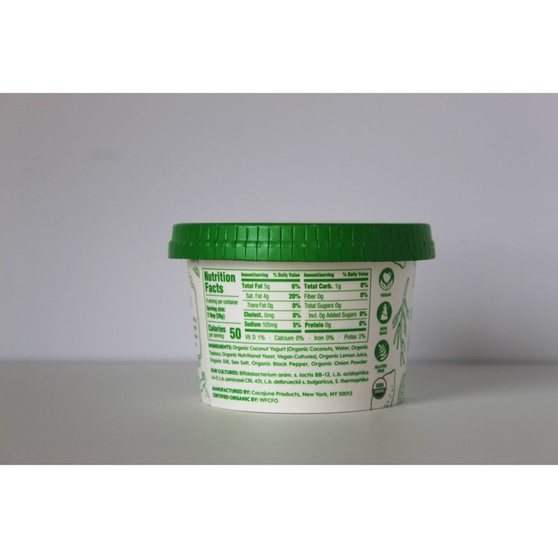 Organic Coconut Yogurt (Organic Coconuts, Water, Organic Tapioca, Organic Nutritional Yeast, Vegan Cultures), Organic Lemon Juice, Organic Dill, Sea Salt, Organic Black Pepper, Organic Onion Powder