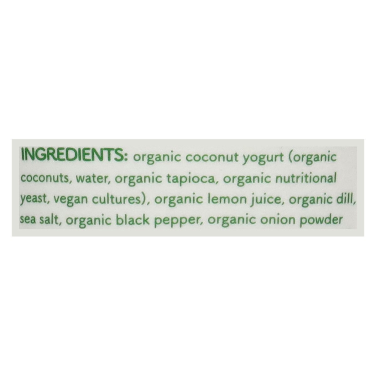 Organic Coconut Yogurt (Organic Coconut, Water, Organic Tapioca, Organic Nutritional Yeast, Vegan Cultures), Organic Lemon Juice, Organic Dill, Sea Salt, Organic Black Pepper, Organic Onion Powder.