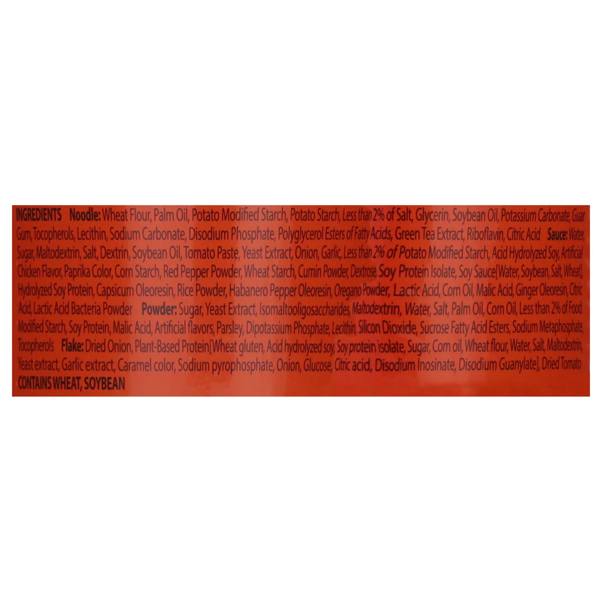 Noodle: Wheat Flour, Palm Oil, Potato Modified Starch, Potato Starch, Less Than 2% of Salt, Glycerin, Soybean Oil, Potassium Carbonate Guar Gum, Tocopherols, Lecithin, Sodium Carbonate, Disodium Phosp…