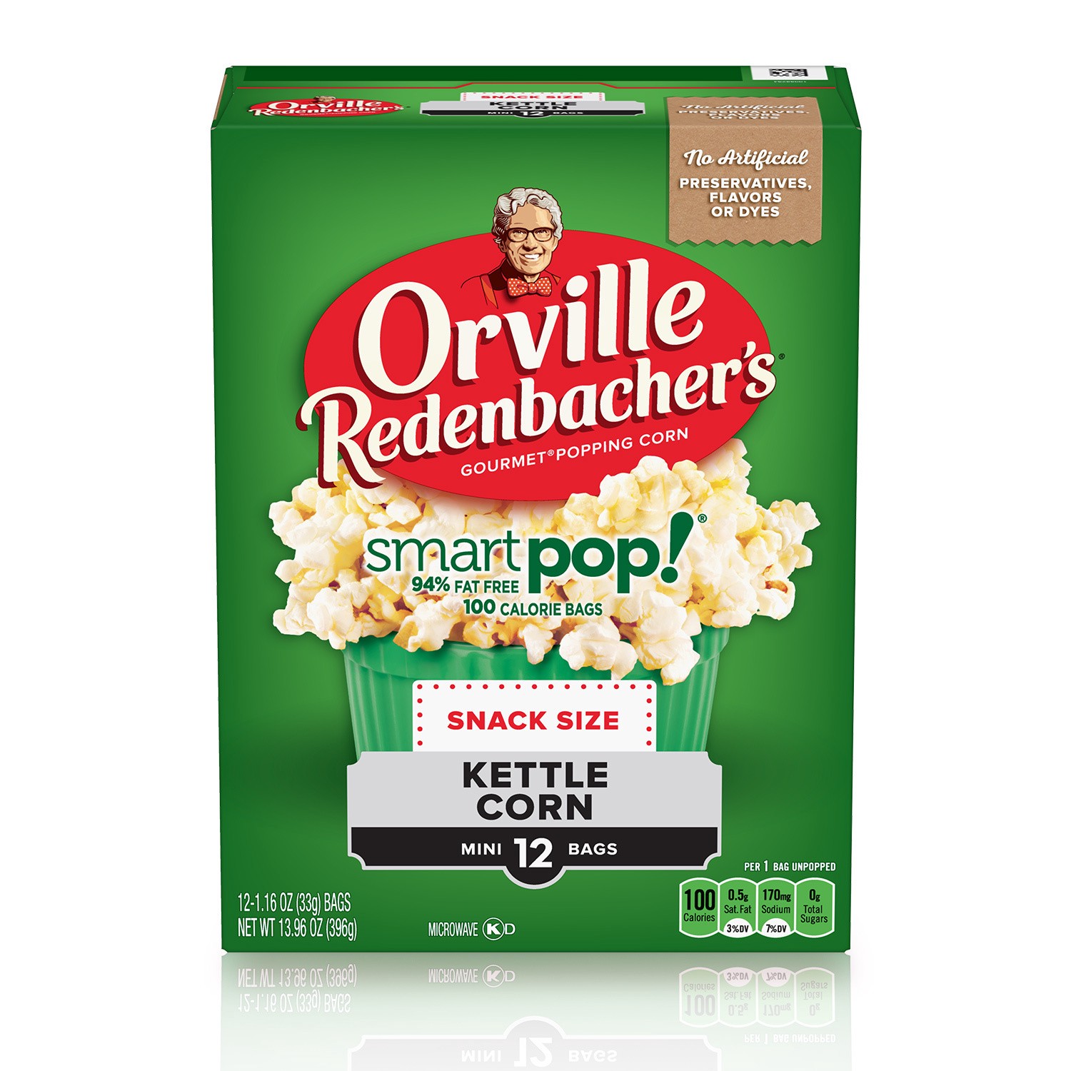 No artificial preservatives, flavors or dyes. Per 1 Bag Unpopped: 100 calories, 0.5 g sat fat (3%DV), 170 mg sodium (7%DV), 0 g total sugars. 15 calories/cup popped (See nutrition information for per …