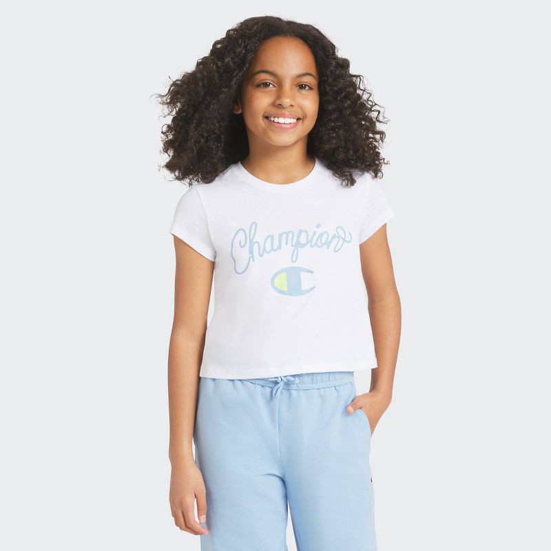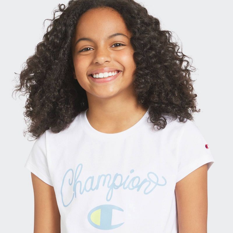 Keep her looking cute with this Champion® Girls' Graphic Baby T-Shirt. Highlighted by bold graphics and a cropped silhouette, it's a total must-get. Made from a lightweight cotton blend, this baby tee…