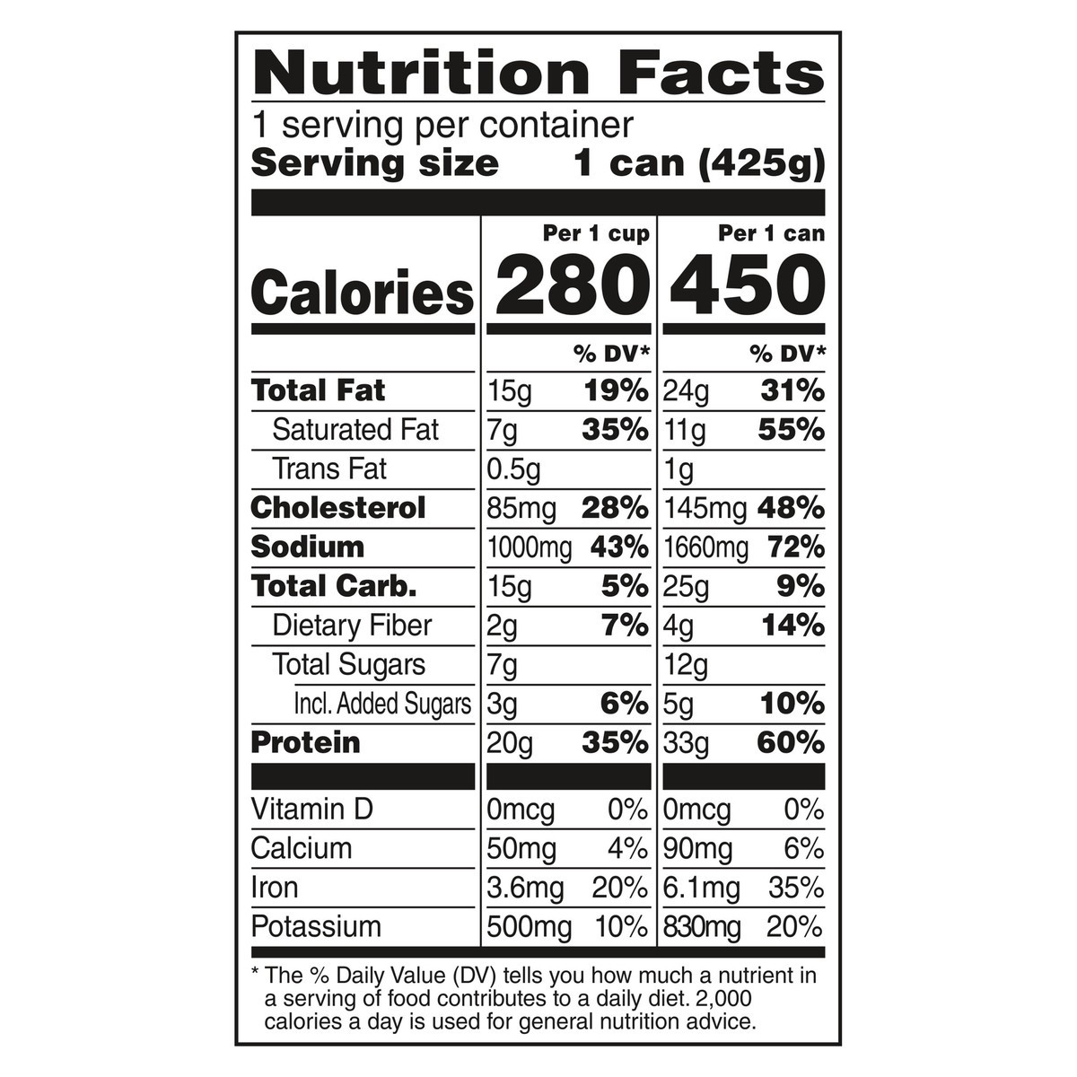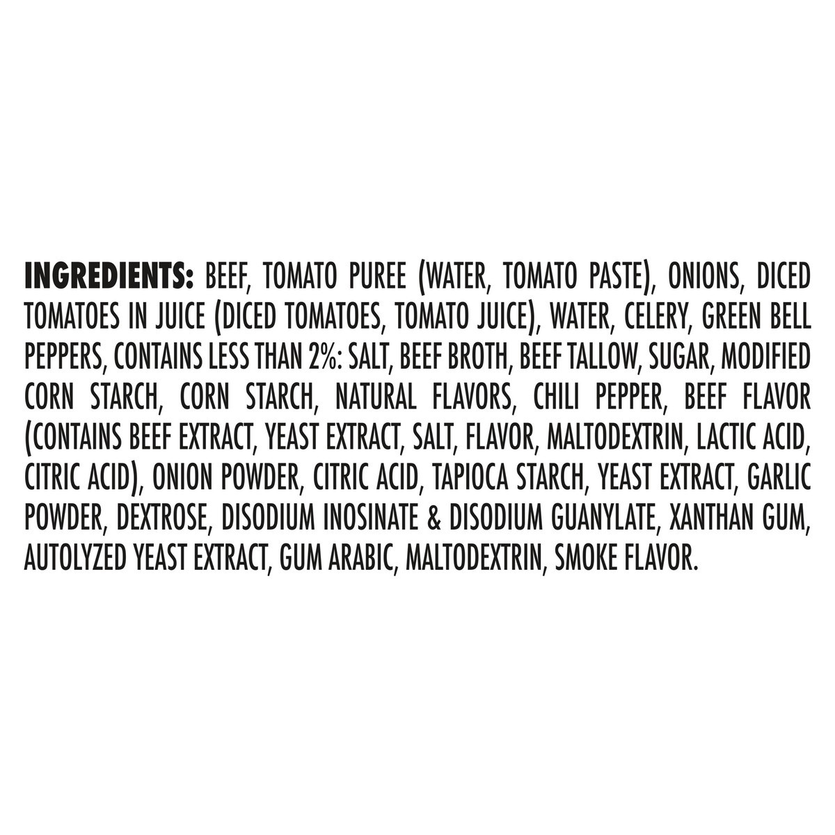 Beef, Tomato Puree (Water, Tomato Paste), Onions, Diced Tomatoes in Juice (Diced Tomatoes, Tomato Juice), Water, Celery, Green Bell Peppers, Contains Less than 2%: Salt, Beef Broth, Beef Tallow, Sugar…