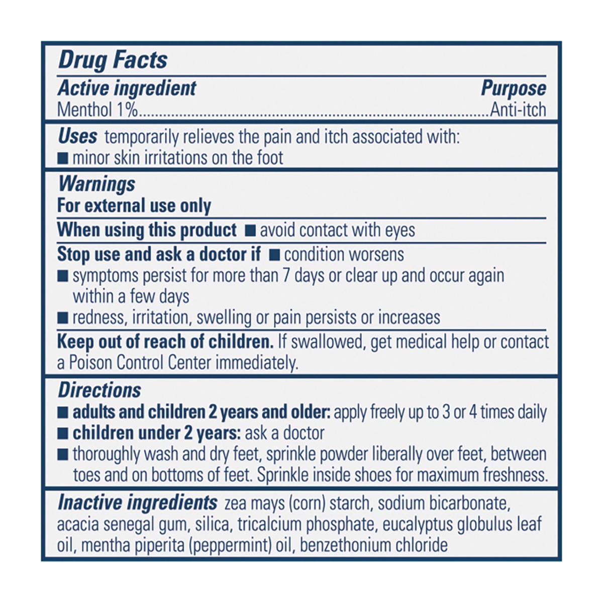 Active Ingredients: Menthol (1 %), Anti-Itch. Inactive Ingredients: Zea Mays (Corn) Starch, Sodium Bicarbonate, Acacia Senegal Gum, Silica, Tricalcium Phosphate, Eucalyptus Globulus Leaf Oil, Mentha P…
