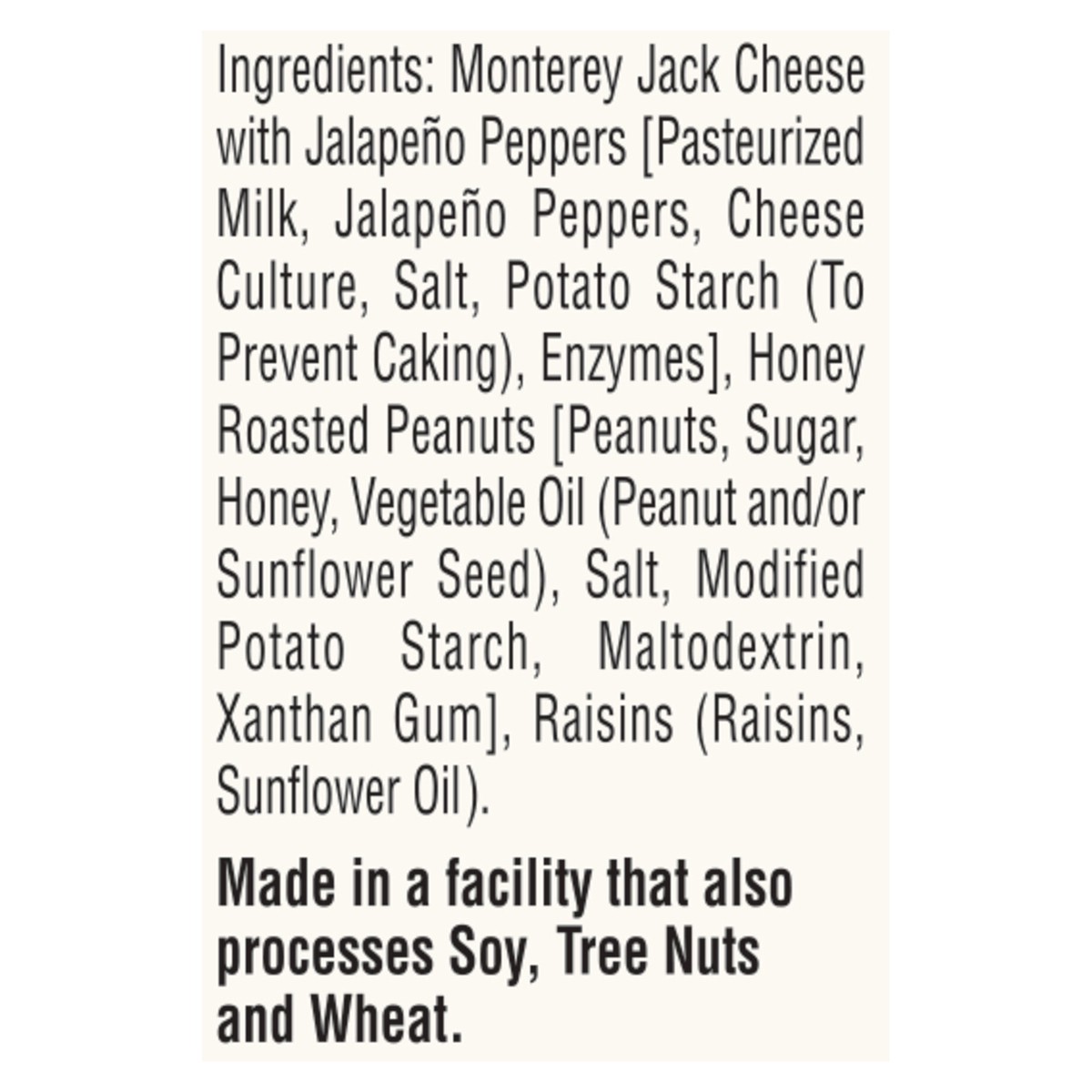 Monterey Jack Cheese with Jalapeno Peppers [Pasteurized Milk, Jalapeno Peppers, Cheese Culture, Salt, Potato Starch (to Prevent Caking), Enzymes], Honey Roasted Peanuts [Peanuts, Sugar, Honey, Vegetab…