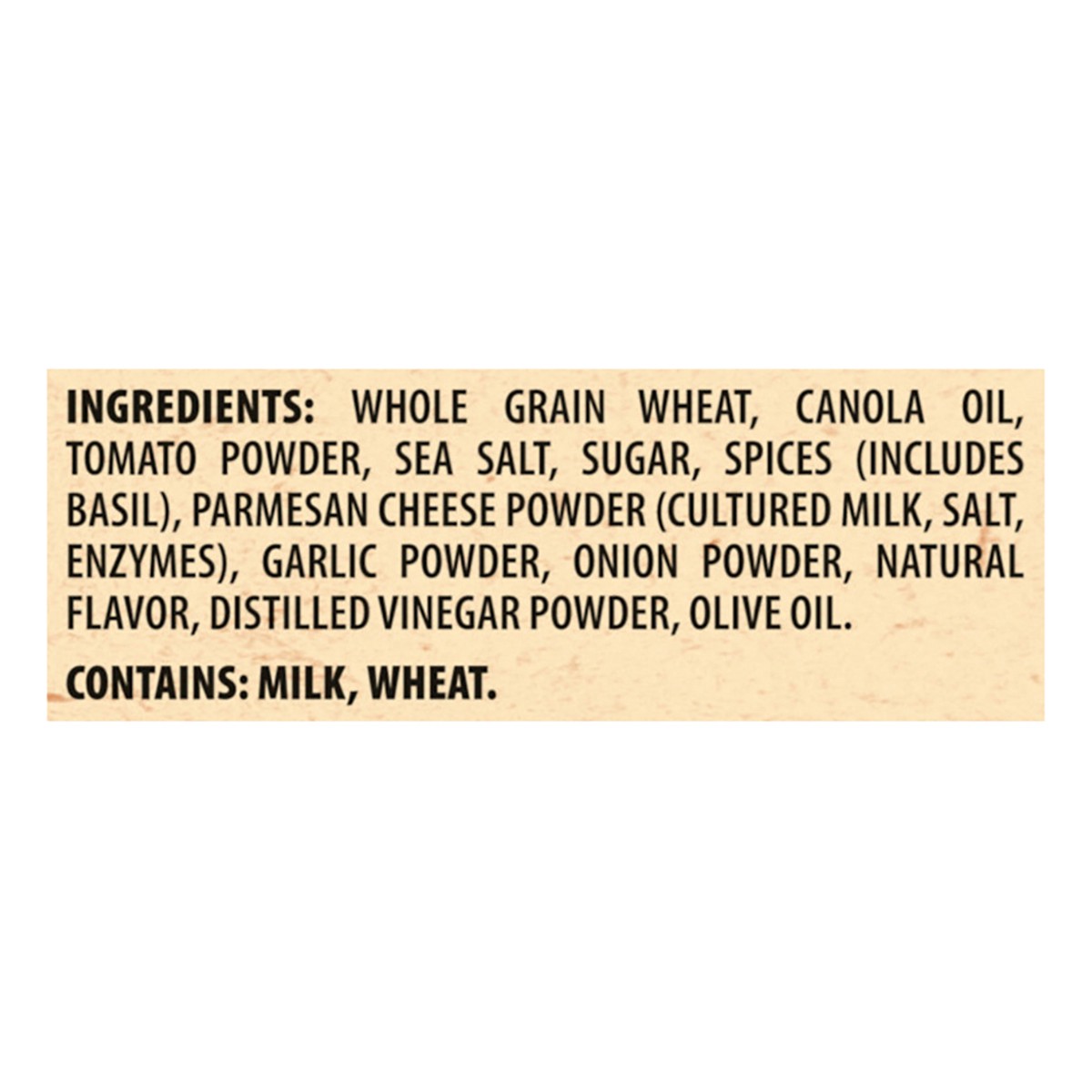 INGREDIENTS: WHOLE GRAIN WHEAT, CANOLA OIL, TOMATO POWDER, SEA SALT, SUGAR, SPICES (INCLUDES BASIL), PARMESAN CHEESE POWDER (CULTURED MILK, SALT, ENZYMES), GARLIC POWDER, ONION POWDER, NATURAL FLAVOR,…