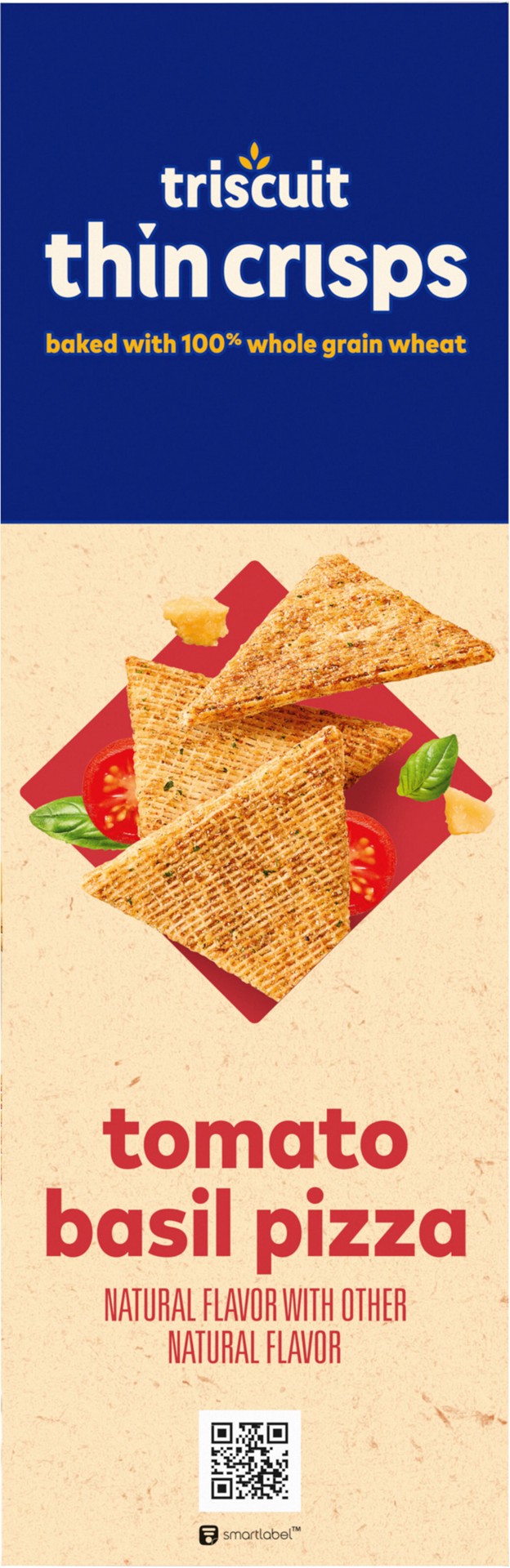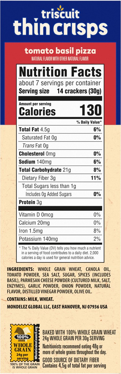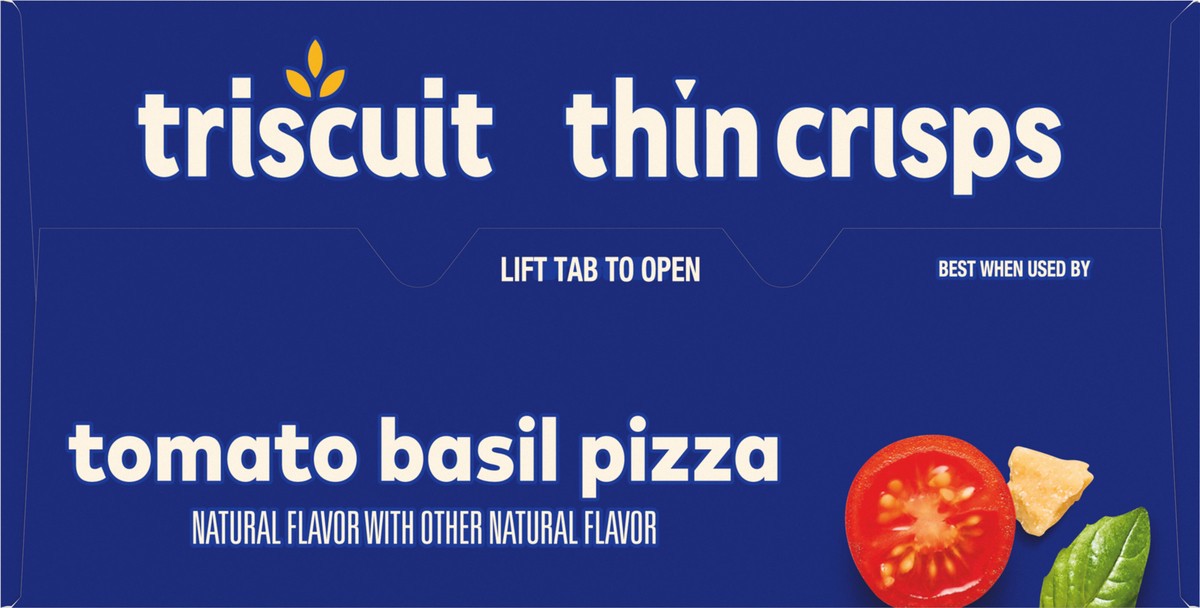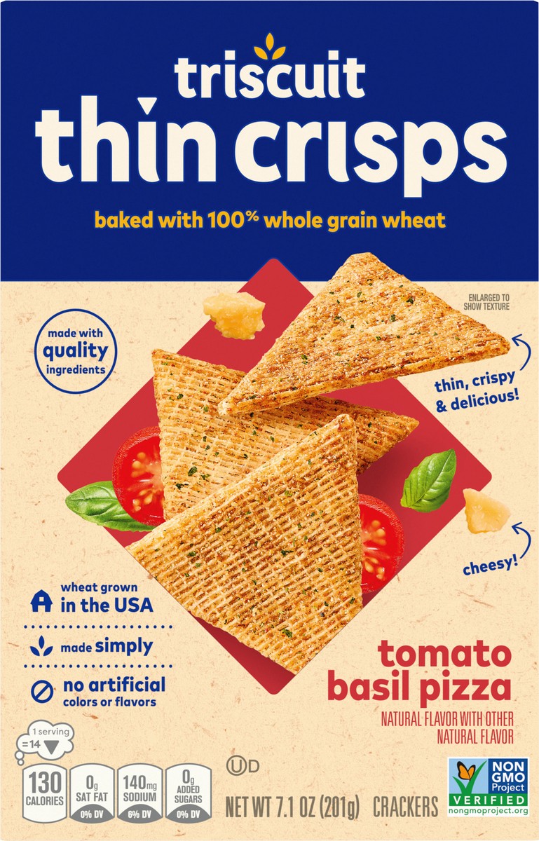Triscuit Thin Crisps Tomato Basil Pizza Whole Grain Wheat Crackers are made simply with quality ingredients. Baked to perfection, these tomato basil crackers use 100% whole grain wheat proudly grown i…