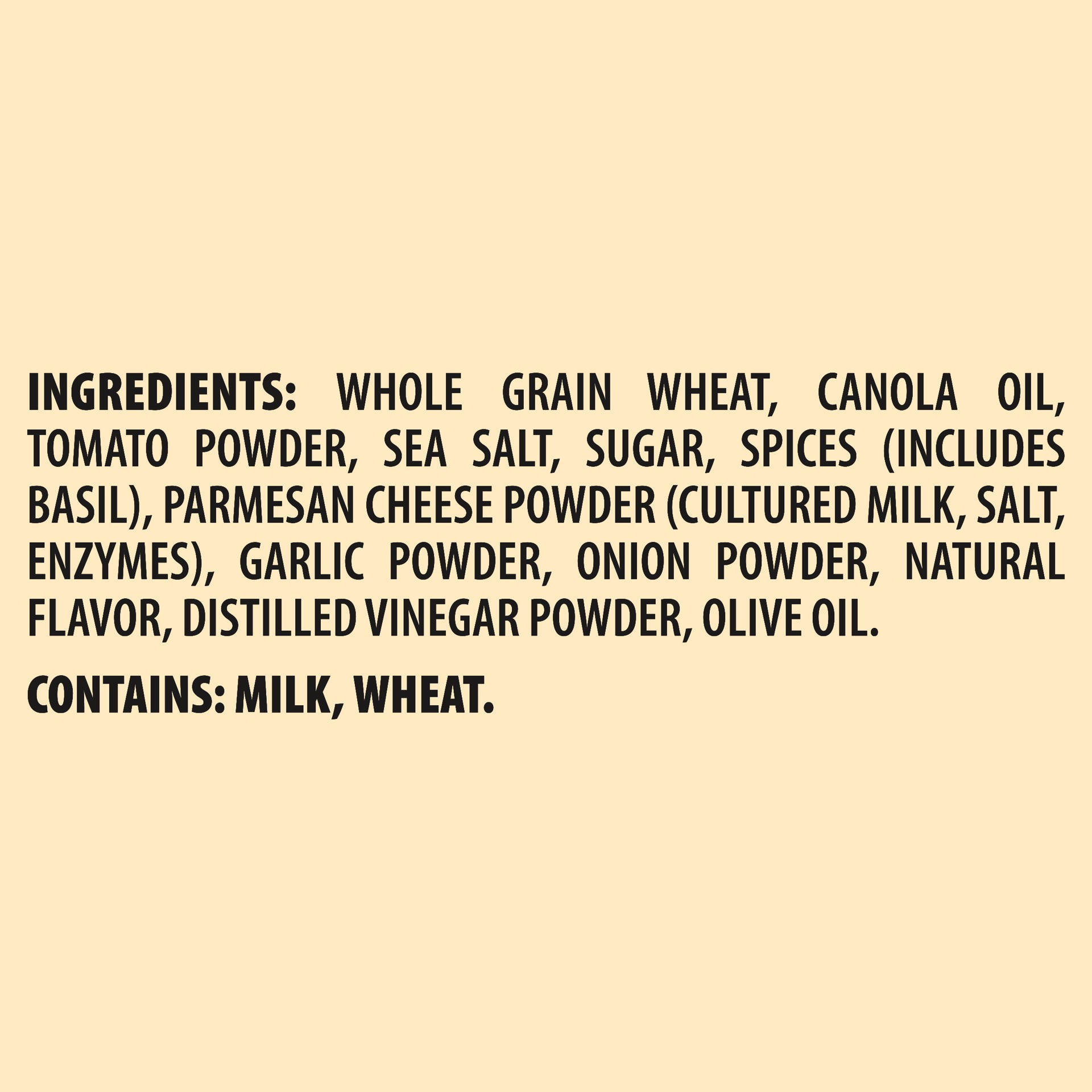Whole Grain Wheat, Canola Oil, Tomato Powder, Sea Salt, Sugar, Spices (Includes Basil), Parmesan Cheese Powder (Cultured Milk, Salt, Enzymes), Garlic Powder, Onion Powder, Natural Flavor, Distilled Vi…