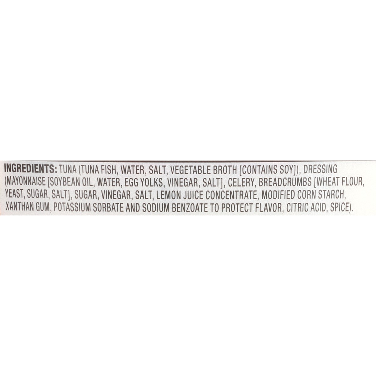 Tuna (Tuna Fish, Water, Salt, Vegetable Broth [Contains Soy]), Dressing (Mayonnaise [Soybean Oil, Water, Egg Yolks, Vinegar, Salt], Celery, Breadcrumbs [Wheat Flour, Yeast, Sugar, Salt], Sugar, Vinega…