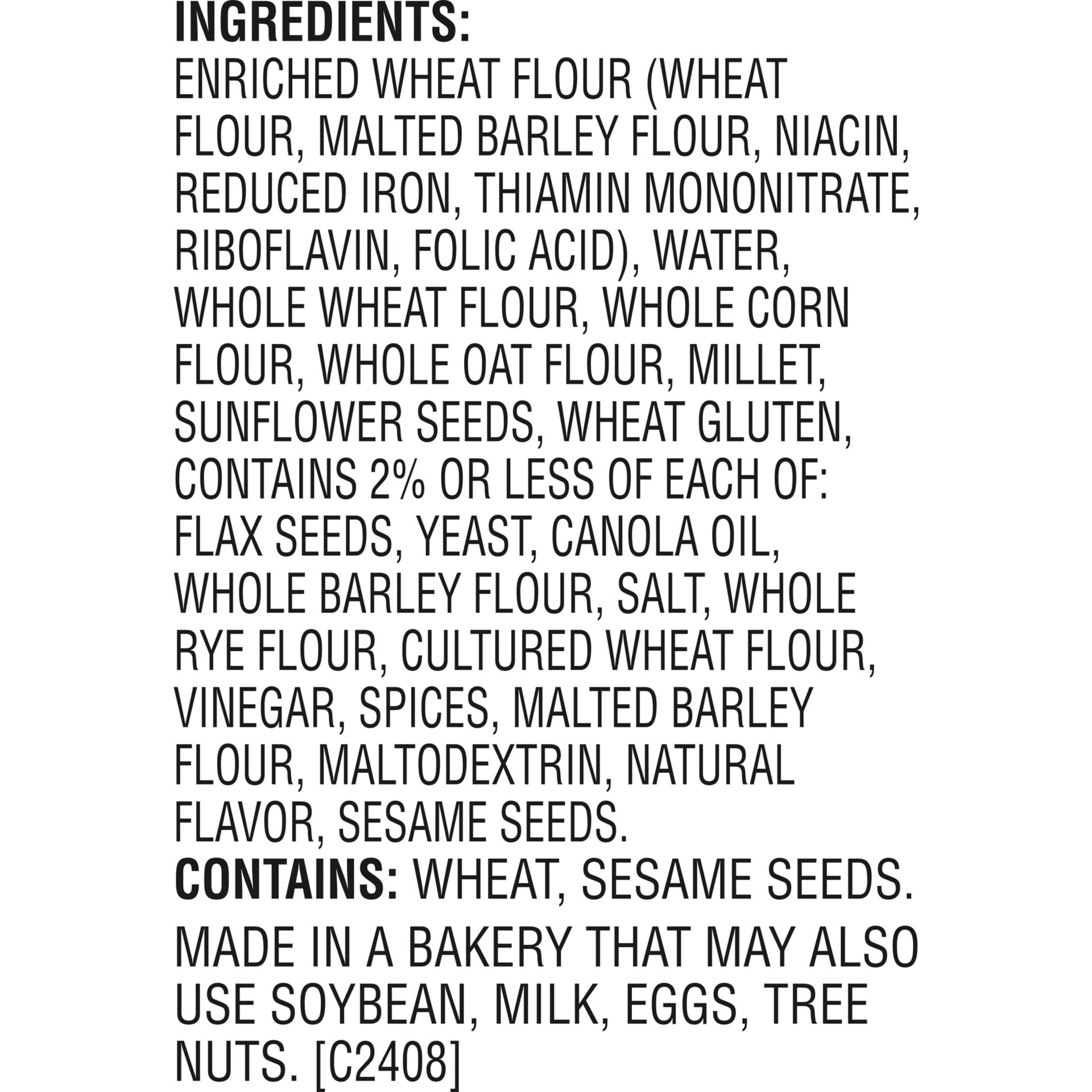 Enriched Wheat Flour (Wheat Flour, Malted Barley Flour, Niacin, Reduced Iron, Thiamin Mononitrate, Riboflavin, Folic Acid), Water, Whole Wheat Flour, Whole Corn Flour, Whole Oat Flour, Millet, Sunflow…