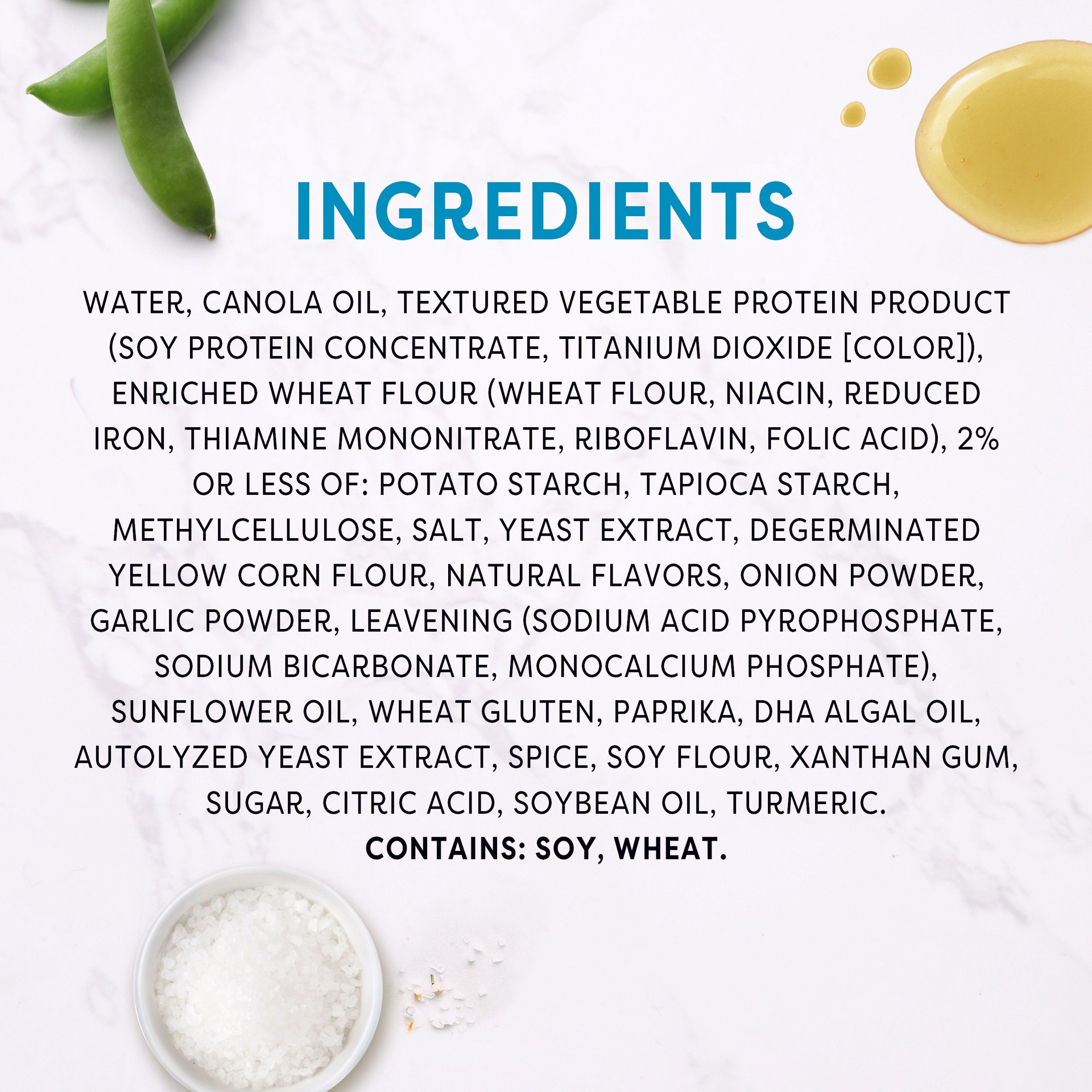 INGREDIENTS: WATER, CANOLA OIL, TEXTURED VEGETABLE PROTEIN PRODUCT (SOY PROTEIN CONCENTRATE, TITANIUM DIOXIDE [COLOR]), ENRICHED WHEAT FLOUR (WHEAT FLOUR, NIACIN, REDUCED IRON, THIAMINE MONONITRATE, R…