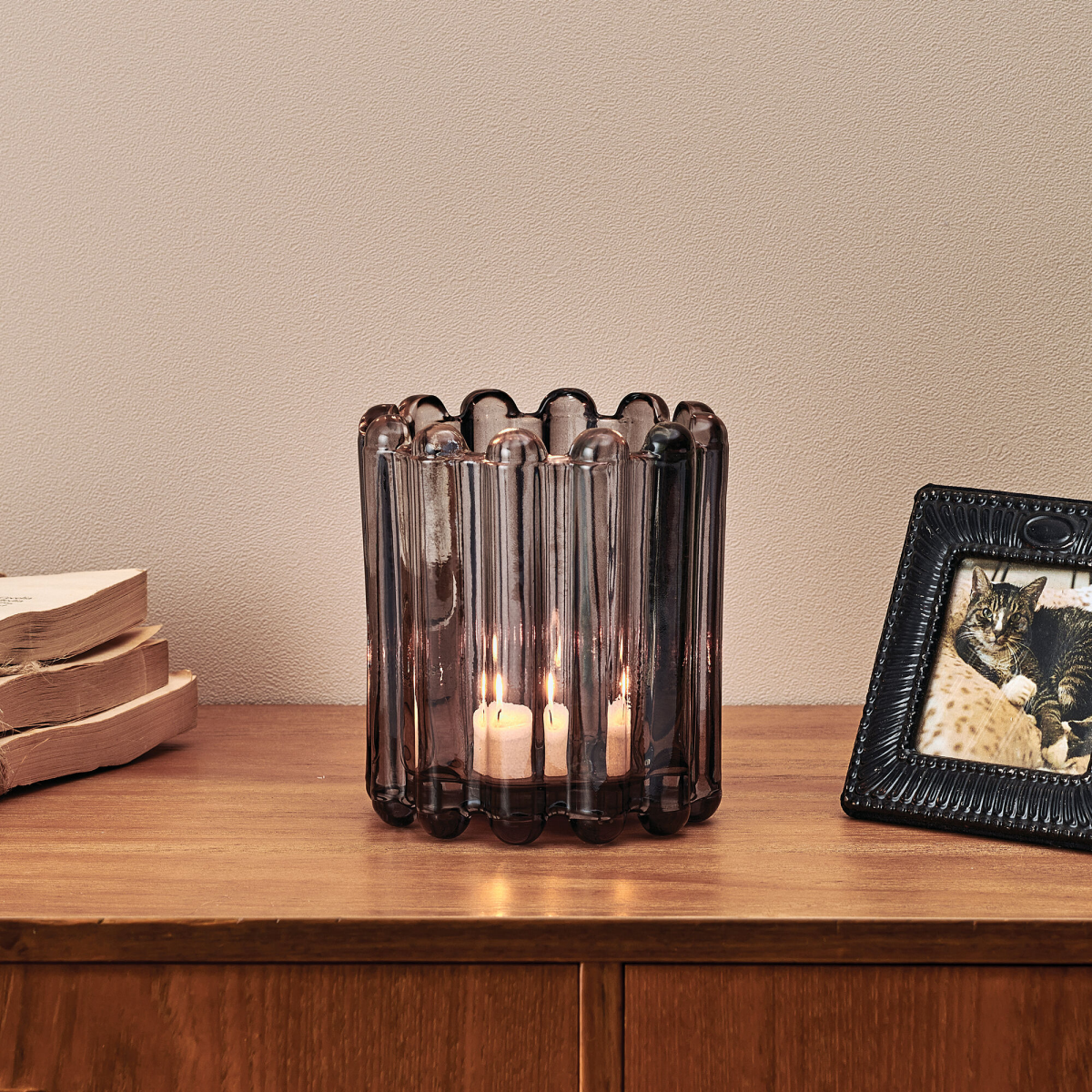 Enhance your décor while adding a soft glow and warm ambience to any room with this Smoke Glass Pillar Candle Holder by Elements. The ridged details and smokey-gray glass bring a subtle touch of style…