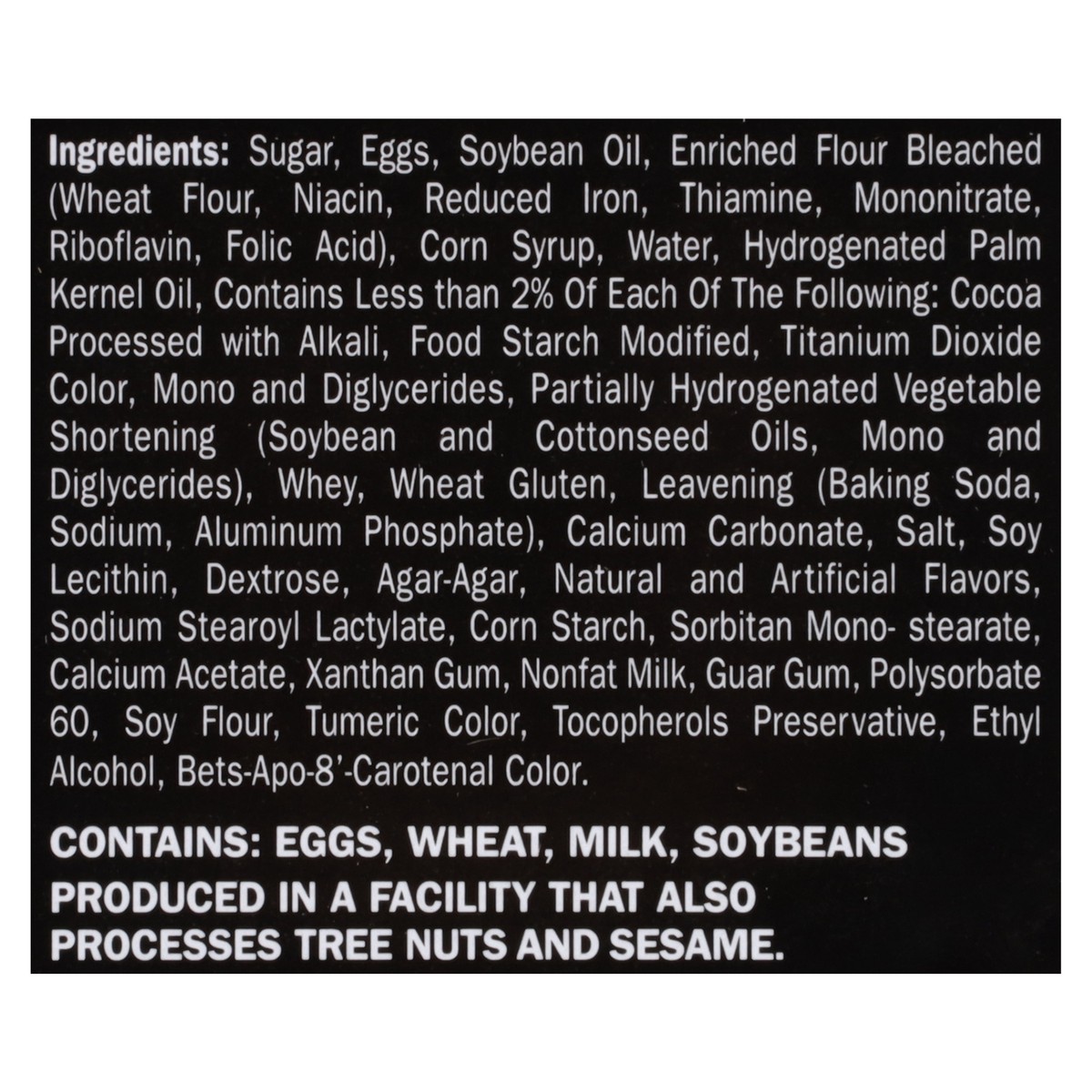 Sugar, Eggs, Soybean Oil, Enriched Flour Bleached (Wheat Flour, Niacin, Reduced Iron, Thiamine, Mononitrate, Riboflavin, Folic Acid), Corn Syrup, Water, Hydrogenated Palm Kernel Oil, Contains Less tha…