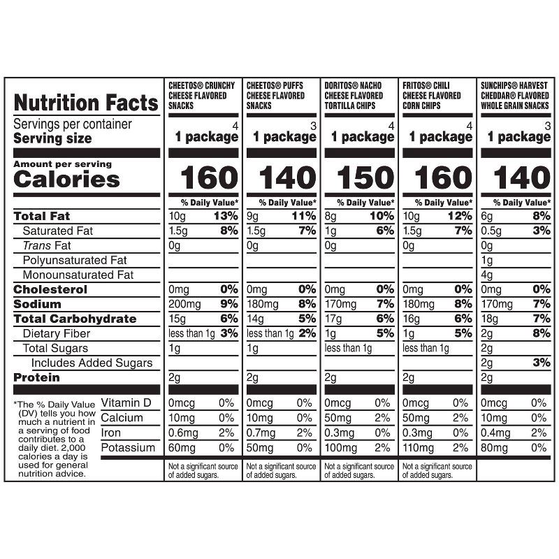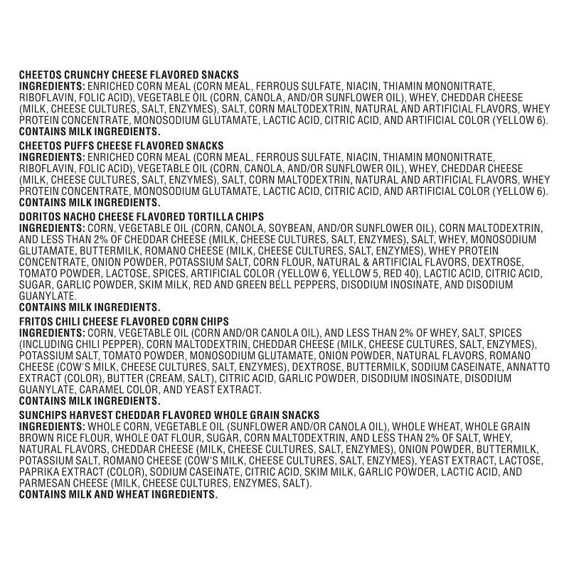 - Frito Lay Cheesy Mix Variety Pack includes 18 individual single serve Frito Lay Snacks Cheesy Mix : (4) Cheetos Crunchy, (3) Sunchips Harvest Cheddar, (3) Cheetos Puffs, (4) Doritos Nacho Cheese and (4) Fritos Chili Cheese.