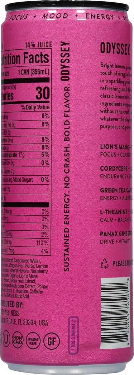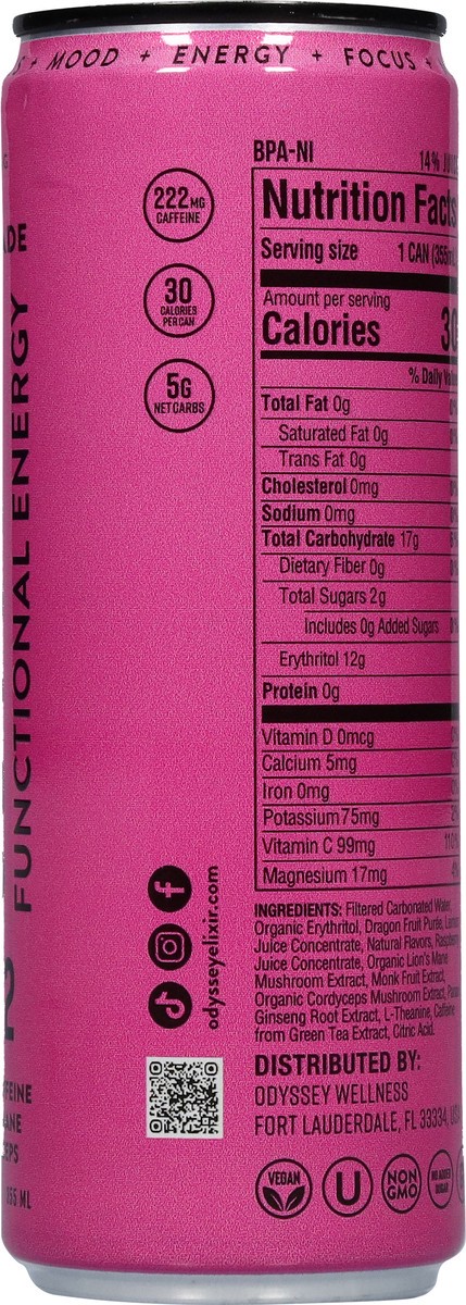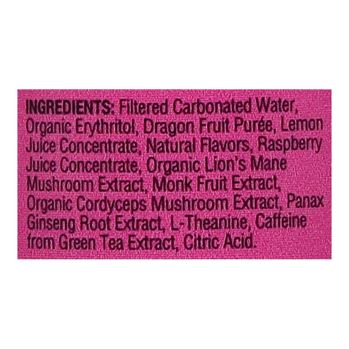 Filtered Carbonated Water, Organic Erythritol, Dragon Fruit Puree, Lemon Juice Concentrate, Natural Flavors, Raspberry Juice Concentrate, Organic Lion's Mane Mushroom Extract, Monk Fruit Extract, Orga…