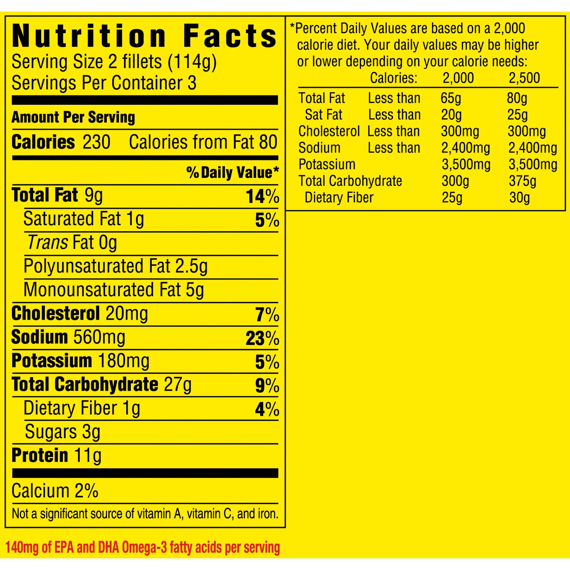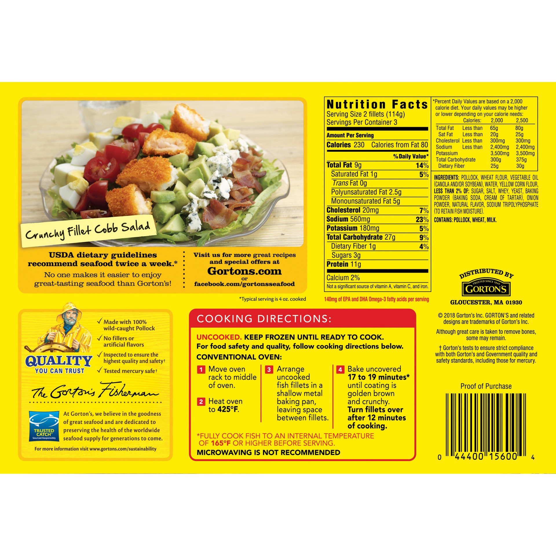 Pollock Fillets: Pollock, Water, Sodium Tripolyphosphate (to Retain Fish Moisture).\nBreadcrumb Coating: Wheat Flour, Water, Yellow Corn Flour, Sugar, Salt, Whey, Yeast, Baking Powder (Baking Soda, Cr…