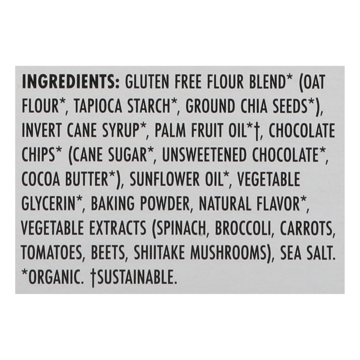 GLUTEN FREE FLOUR BLEND* (OAT FLOUR*, TAPIOCA STARCH*, GROUND CHIA SEEDS*), INVERT CANE SYRUP*, PALM FRUIT OIL*†, CHOCOLATE CHIPS* (CANE SUGAR*, UNSWEETENED CHOCOLATE*, COCOA BUTTER*), SUNFLOWER OIL*,…