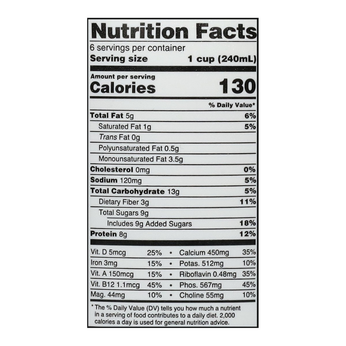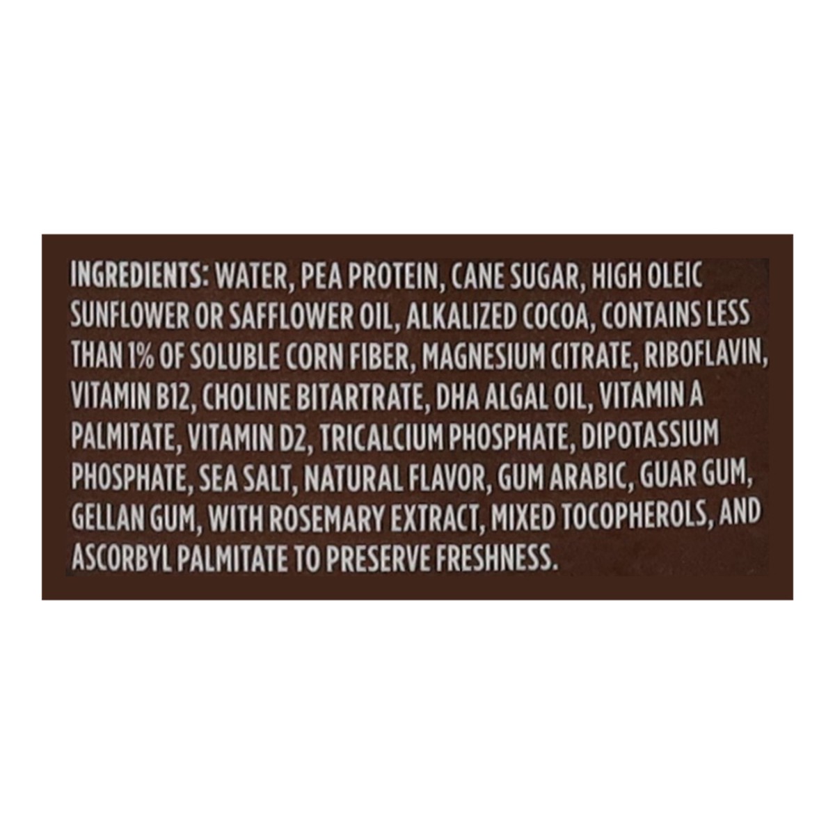 WATER, PEA PROTEIN, CANE SUGAR, HIGH OLEIC SUNFLOWER OR SAFFLOWER OIL, ALKALIZED COCOA, CONTAINS LESS THAN 1% OF SOLUBLE CORN FIBER, MAGNESIUM CITRATE, RIBOFLAVIN, VITAMIN B12, CHOLINE BITARTRATE, DHA…