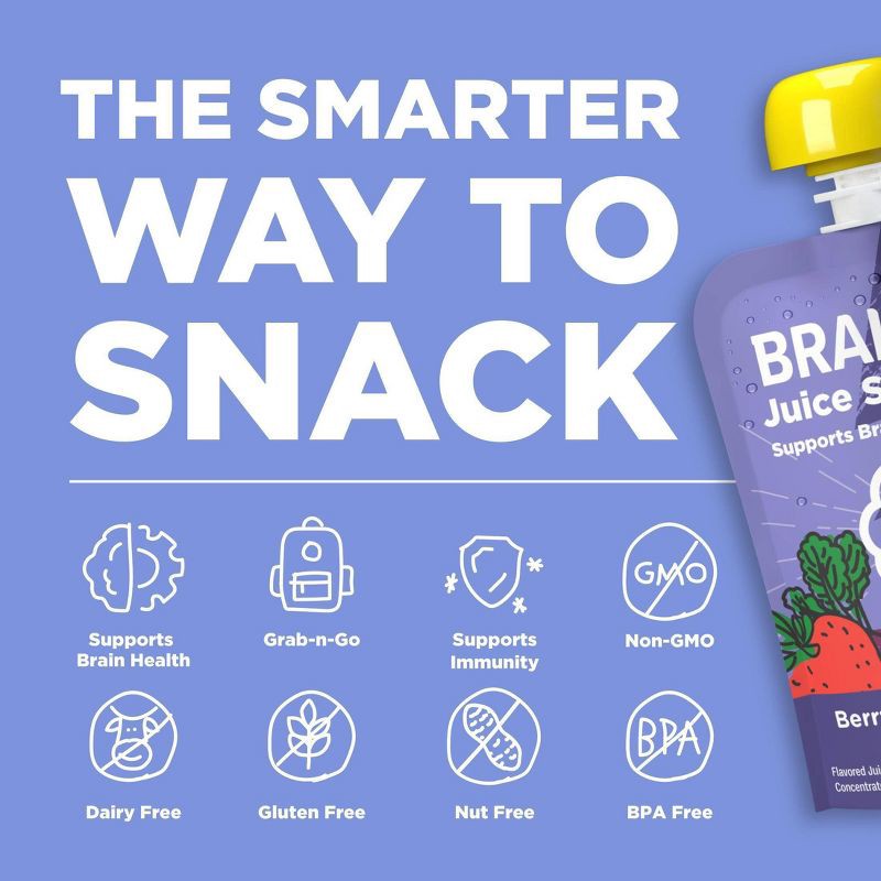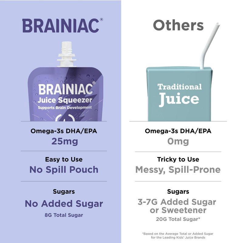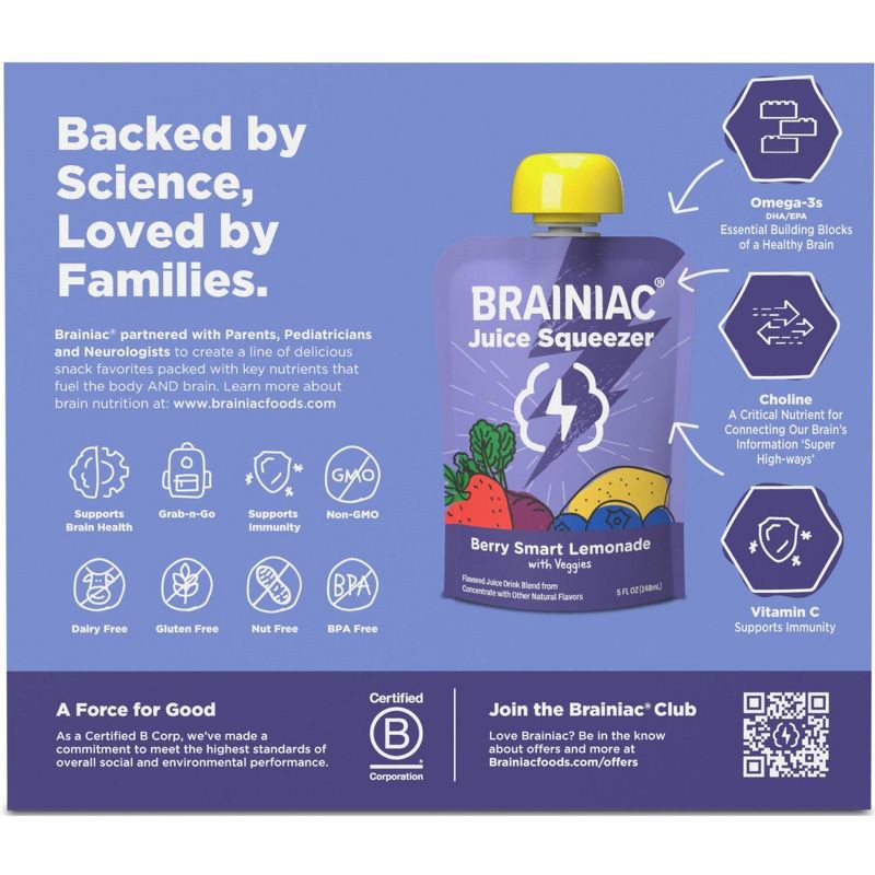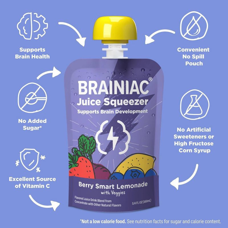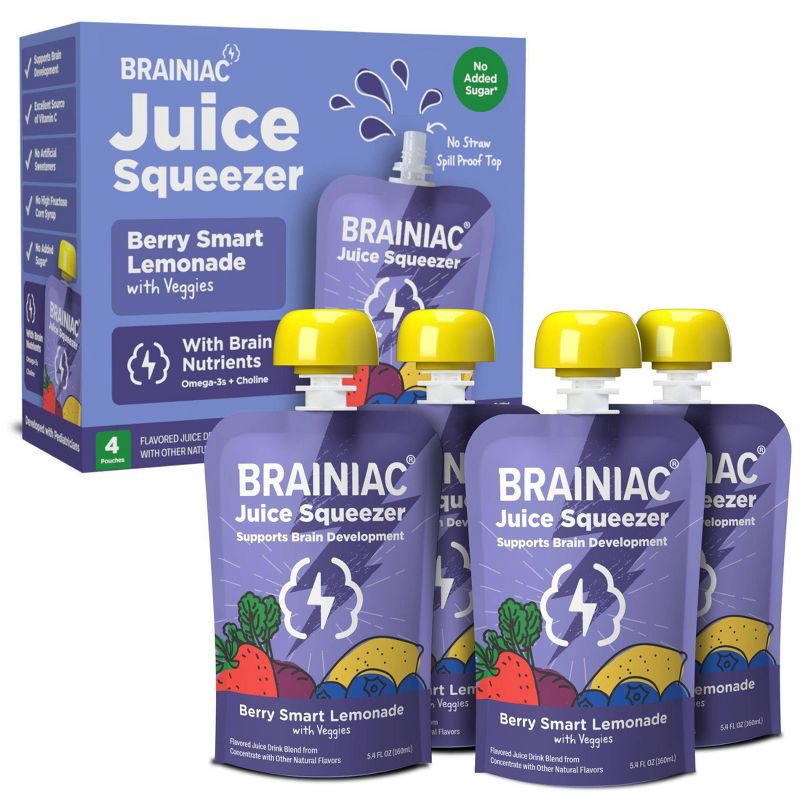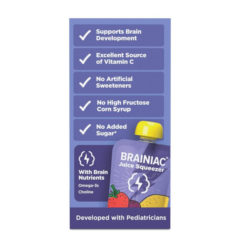 - DEVELOPED WITH EXPERTS: At Brainiac we work with leading Pediatricians, Neurologists and Nutritionists to ensure we're making products that include the key nutrients growing minds need. Brainiac Juice Squeezer are the first kids' juice to include Omega-3s and Choline - the key building blocks for healthy brain development. Each of our pouches is also an excellent source of Vitamin C.