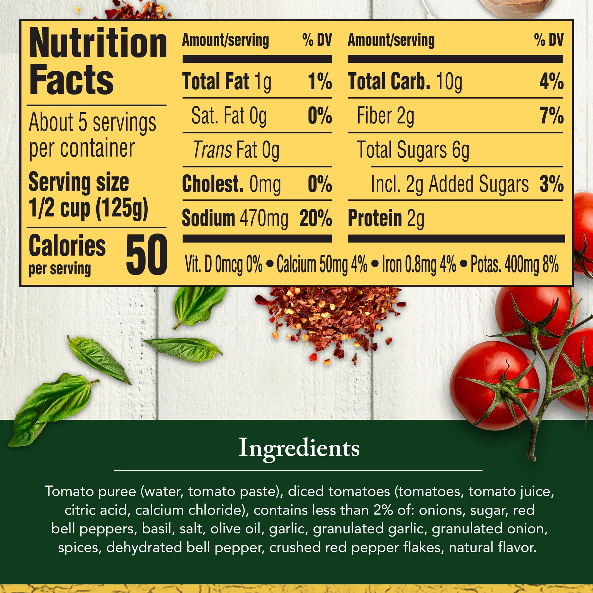 TOMATO PUREE (WATER, TOMATO PASTE), TOMATOES IN JUICE (TOMATOES, TOMATO JUICE, CITRIC ACID, CALCIUM CHLORIDE), CONTAINS LESS THAN 2% OF SUGAR, ONIONS, RED BELL PEPPERS, BASIL, SALT, OLIVE OIL, GARLIC,…