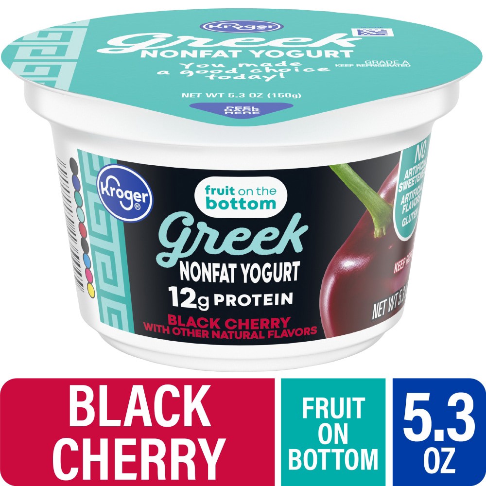 Kroger® Fruit on the Bottom Black Cherry Nonfat Greek Yogurt Cup is pure joy in every spoonful! Made with cultured nonfat milk and succulent cherries, it delivers 12g protein per cup. Enjoy the lip-sm…