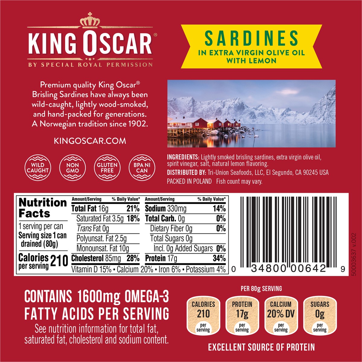 King Oscar by special royal permission. Premium quality King Oscar Brisling Sardines have always been wild-caught, lightly wood-smoked, and hand-packed for generations. A Norwegian tradition since 190…