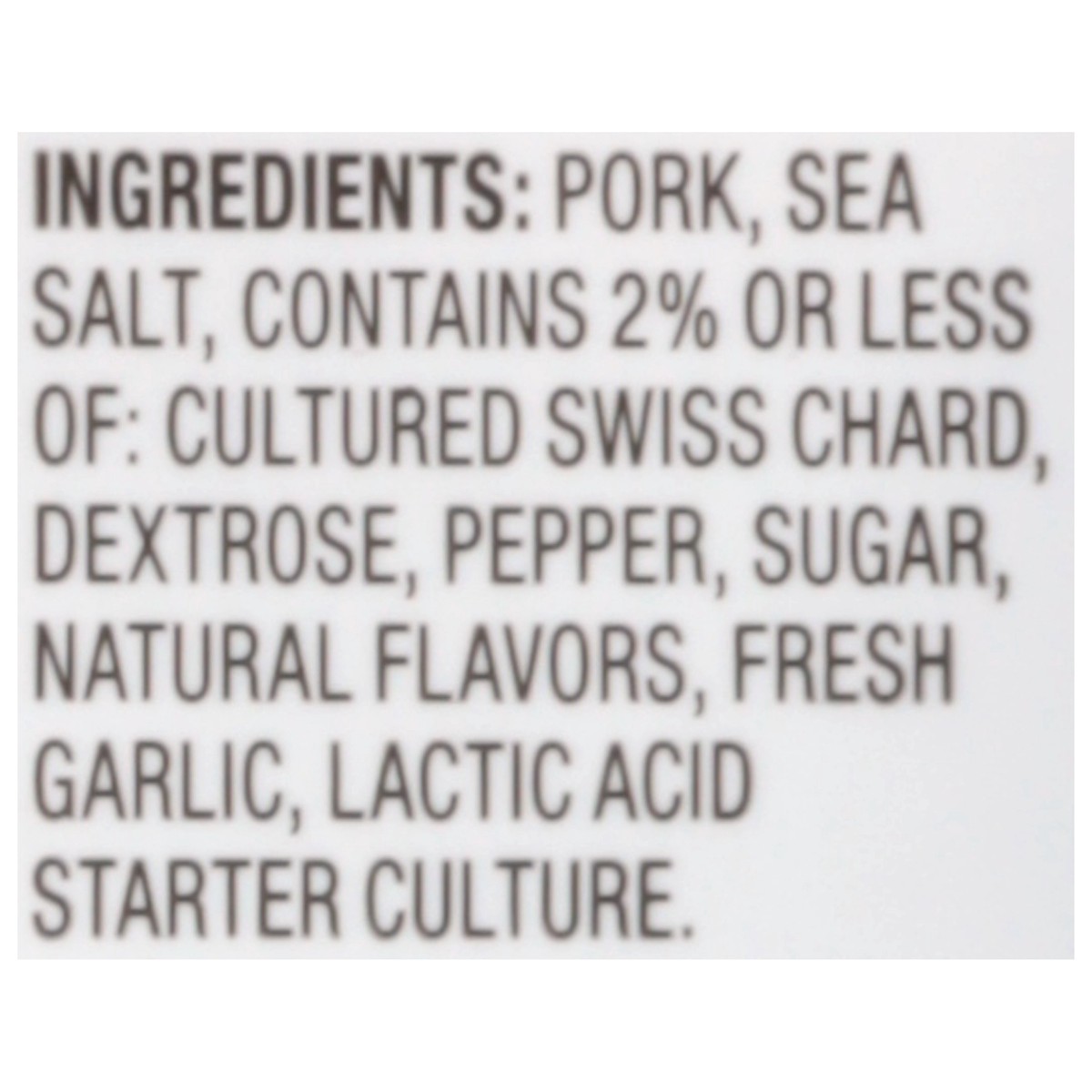 Pork, Sea Salt, Contains 2% or Less of: Cultured Swiss Chard, Dextrose, Pepper, Sugar, Natural Flavors, Fresh Garlic, Lactic Acid Starter Culture.