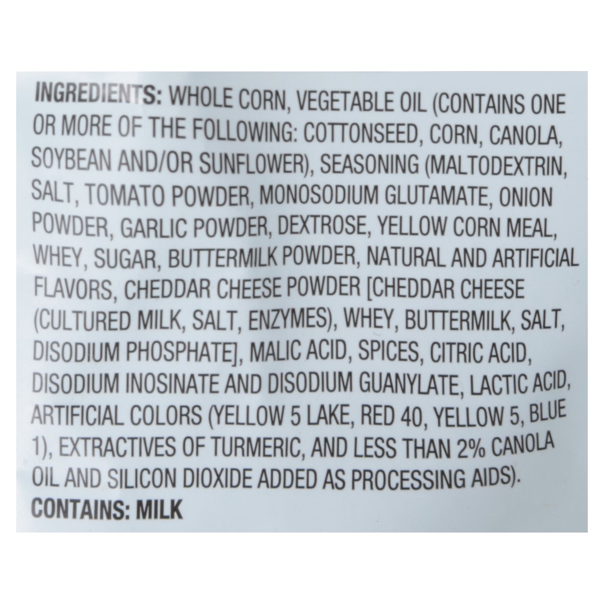 Whole Corn, Vegetable Oil (Contains One or More of the Following: Cottonseed, Corn, Canola, Soybean, and/or Sunflower), Seasoning (Maltodextrin, Salt, Tomato Powder, Monosodium Glutamate, Onion Powder…