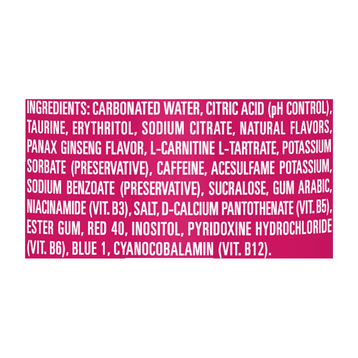 Carbonated Water, Citric Acid (pH Control), Taurine, Erythritol, Sodium Citrate, Natural Flavors, Panax Ginseng Flavor, L-Carnitine L-Tartrate, Potassium Sorbate (Preservative), Caffeine, Acesulfame P…