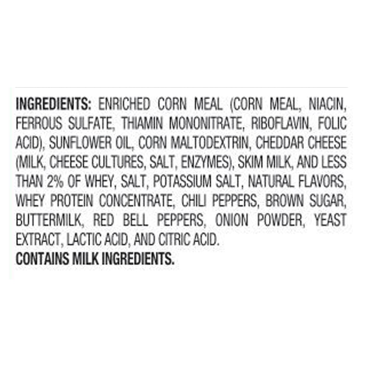 Enriched Corn Meal (Corn Meal, Niacin, Ferrous Sulfate, Thiamin Mononitrate, Riboflavin, Folic Acid), Sunflower Oil, Corn Maltodextrin, Cheddar Cheese (Milk, Cheese Cultures, Salt, Enzymes), Skim Milk…