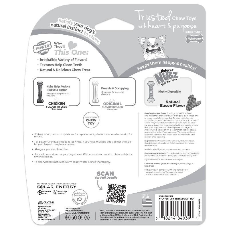 This Nylabone Variety Value Pack includes one Dental Chew toy, one Power Chew toy, and one Natural Nubz chew treat. Made of durable nylon for powerful chewers, the Dental Chew toy is designed with gen…