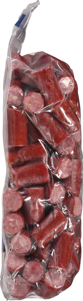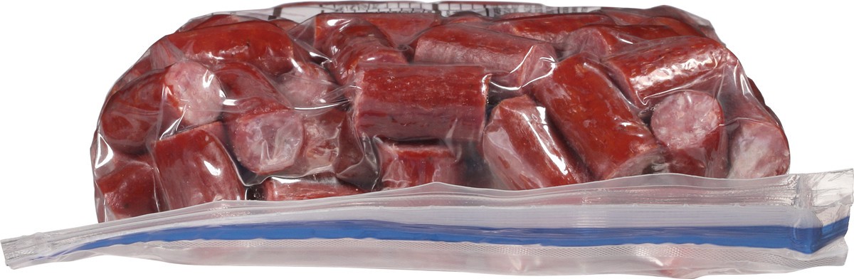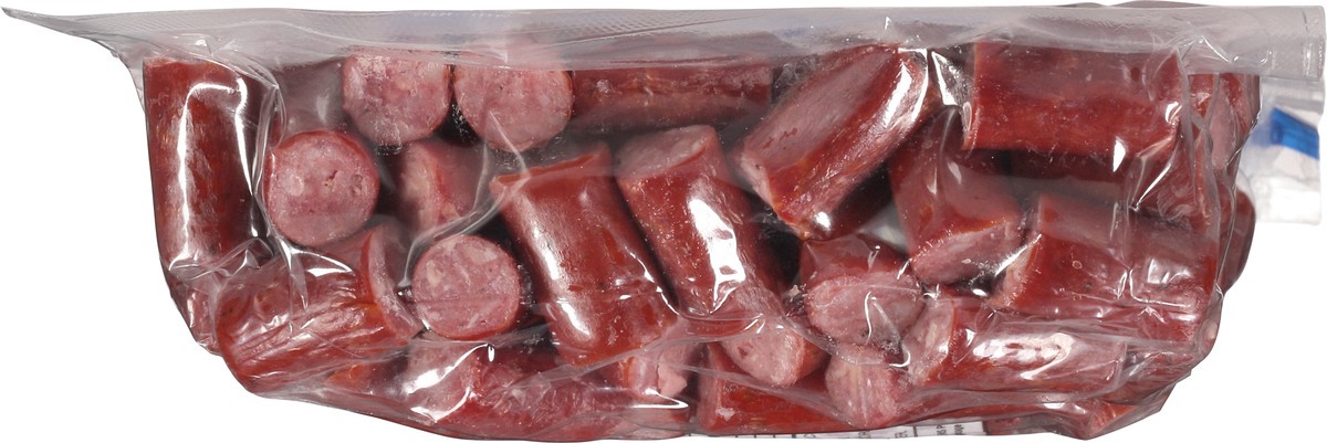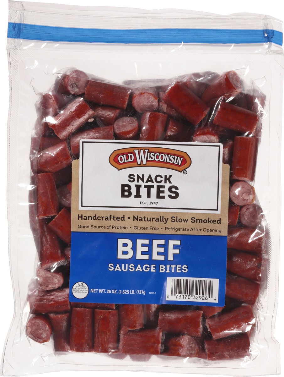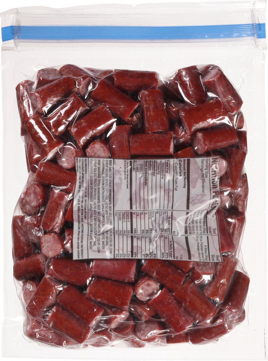 Beef Sausage Bites Ingredients: Beef, Salt, Contains 2% or Less of: Corn Syrup Solids, Spices, Dextrose, Lactic Acid Starter Culture, Natural Flavorings, Sodium Erythorbate, Garlic Powder, Sodium Nitr…