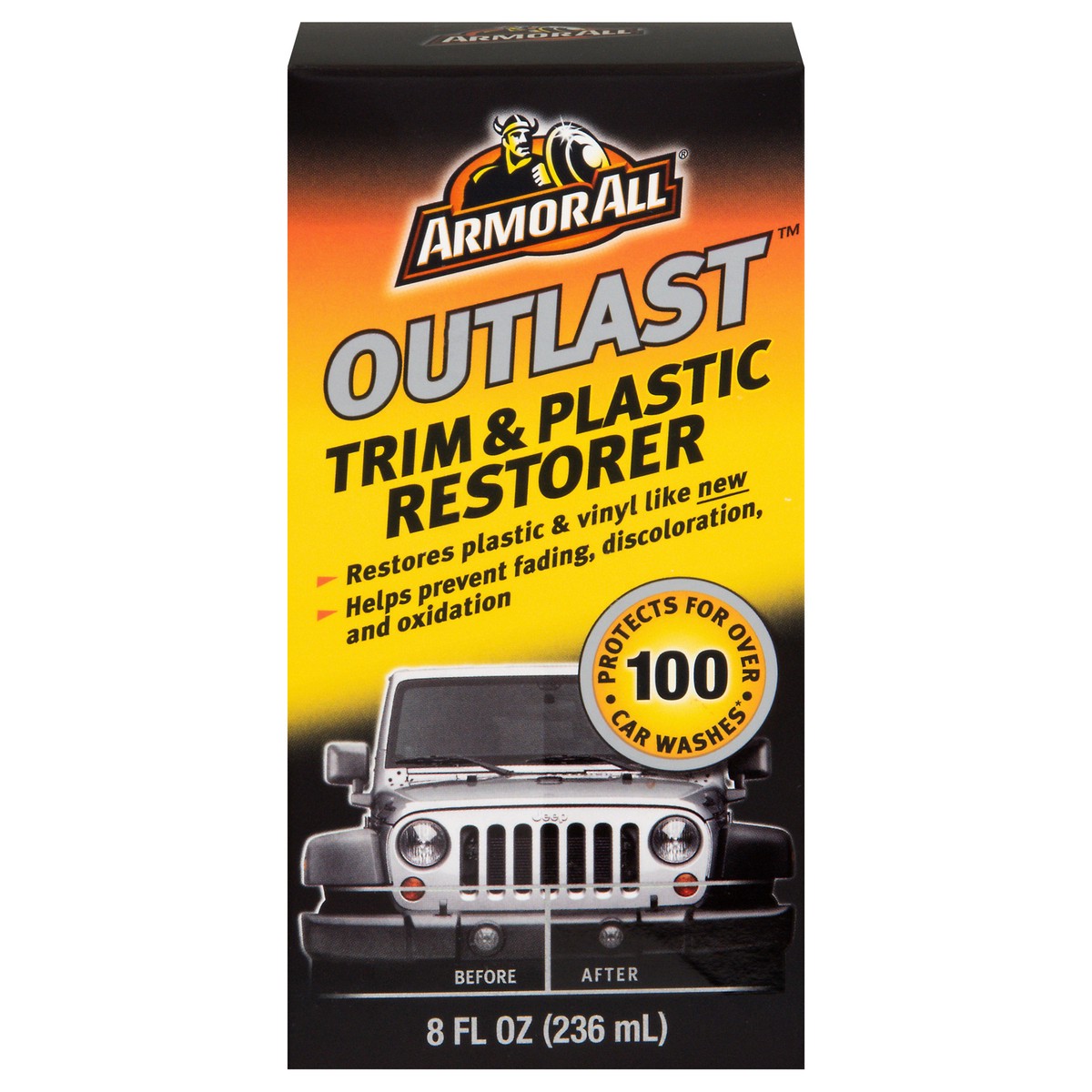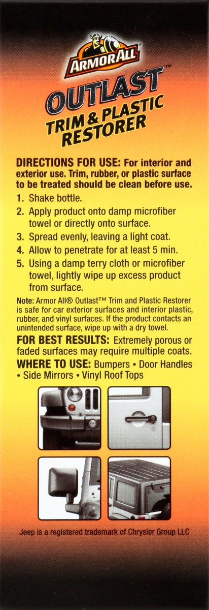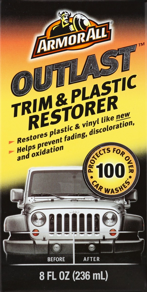 - Armor All Outlast Trim and Plastic Restorer helps rejuvenate worn and weathered plastic, vinyl and rubber trim to help them look like new again. This car protectant helps prevent fading, discoloration, oxidation and damage caused by UV rays. Delivering protection for over 100 car washes, this formula is long lasting and effective. This plastic restorer is safe for all trim colors, letting you use it on multiple vehicles. Quick and simple to use, just apply this UV protectant directly onto the surface, spread evenly, let penetrate for five minutes and wipe clean. Armor All Trim and Plastic Restorer is the perfect addition to your car care products, whether you''re detailing your motorcycle, classic car or daily ride.