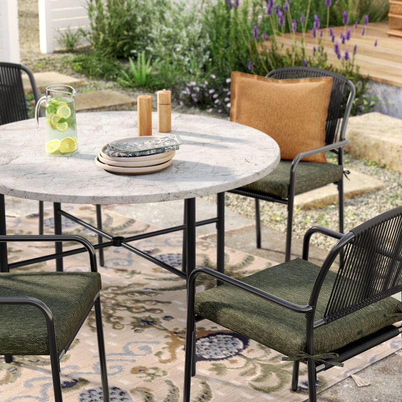 Upgrade your outdoor seating area with this Solid Outdoor Chair Cushion from Threshold™. Made from recycled polyester material with polyester filling, the dark green chair cushion provides cozy comfor…