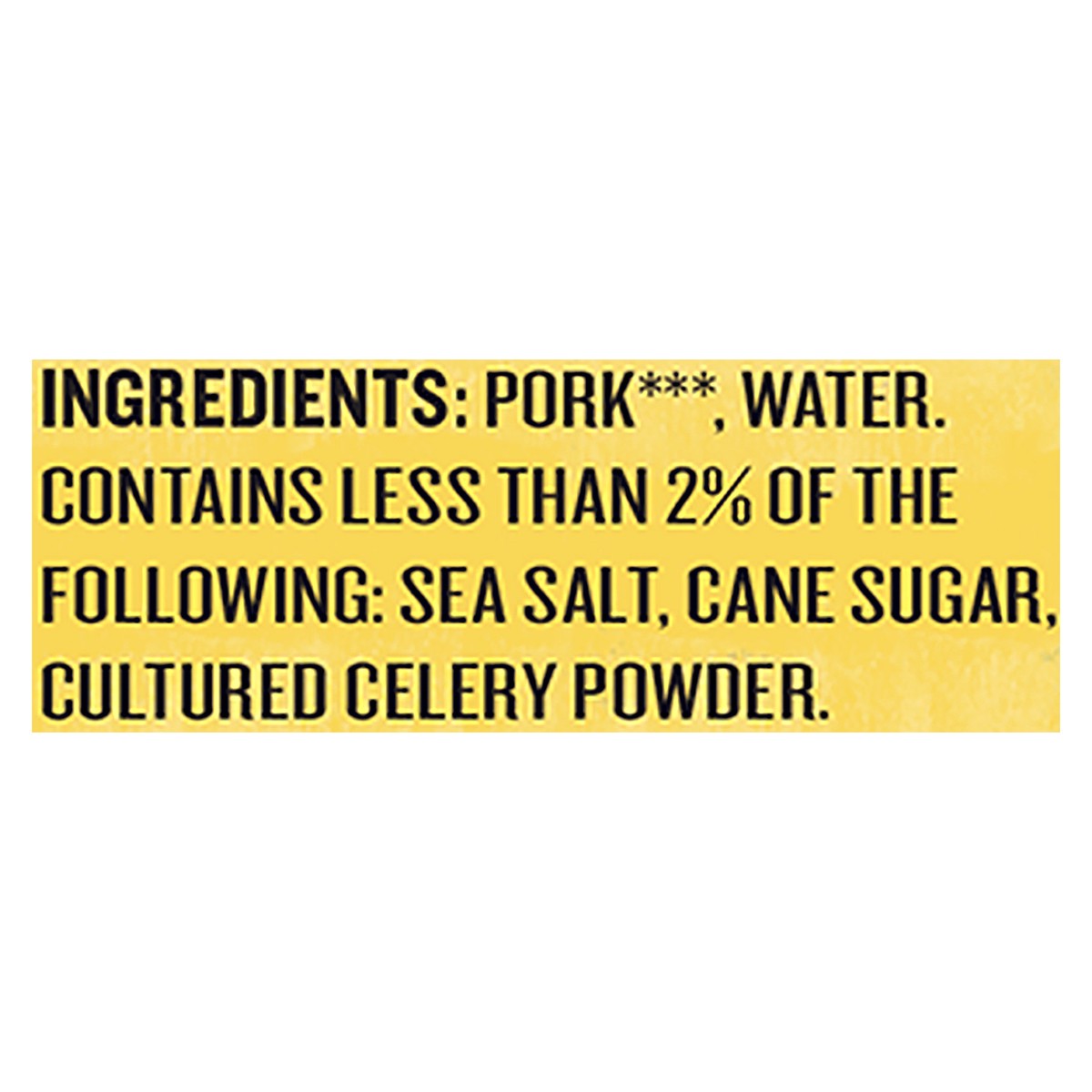 Pork (Pork Never Administered Antibiotics or Fed Animal By-Products), Water, Contains Less than 2% of the Following: Sea Salt, Cane Sugar, Cultured Celery Powder.