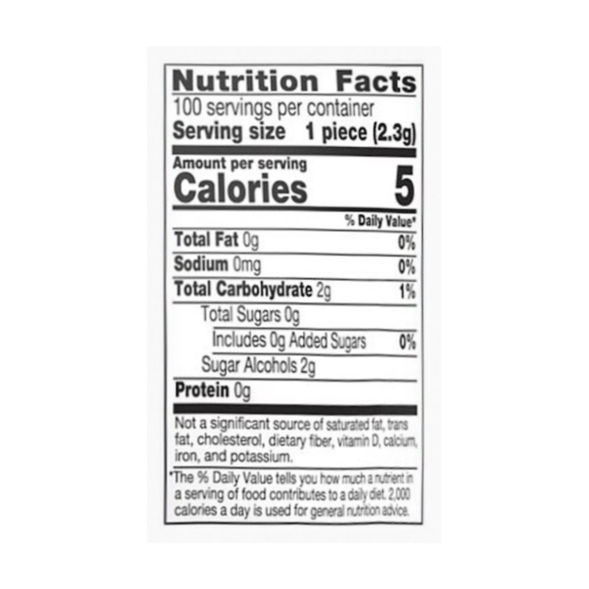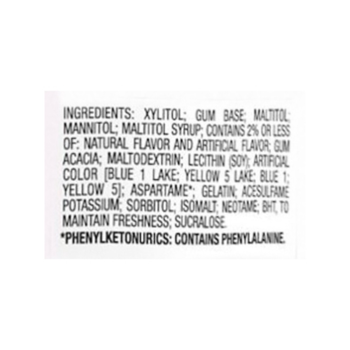 Xylitol; Gum Base: Maltitol; Mannitol; Maltitol Syrup; Contains 2% or Less of: Natural Flavor and Artificial Flavor; Gum Acacia; Maltodextrin; Lecithin (Soy); Artificial Color [Blue 1 Lake; Yellow 5 L…