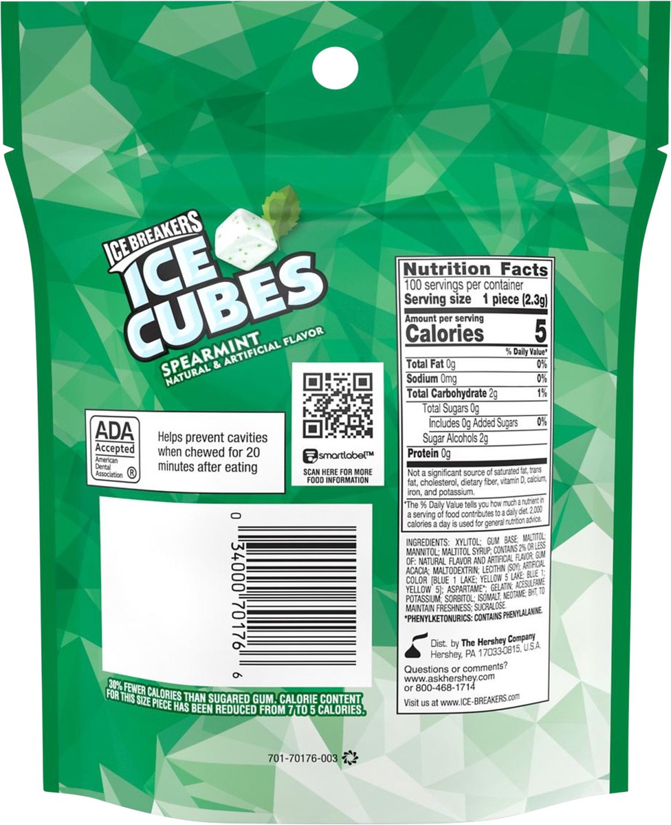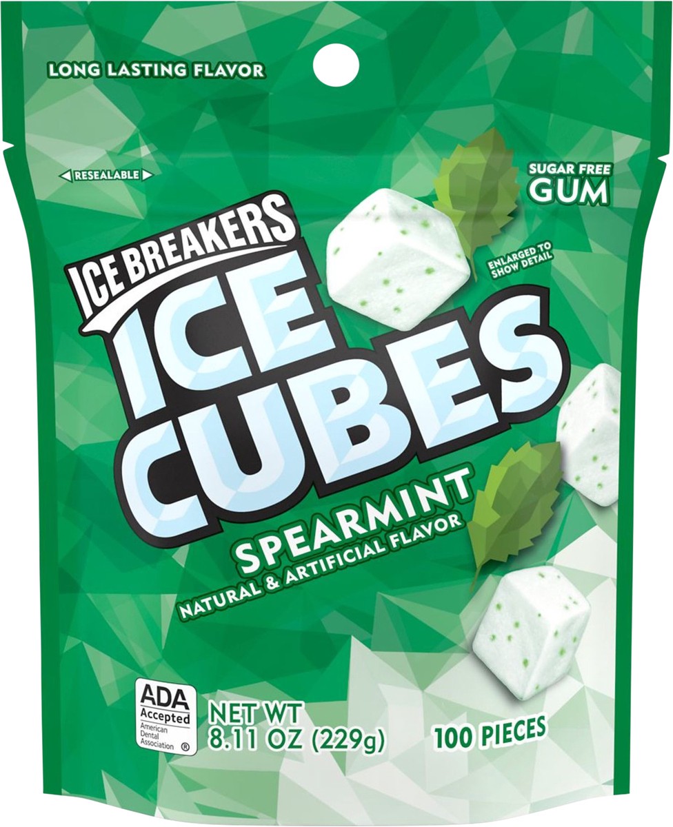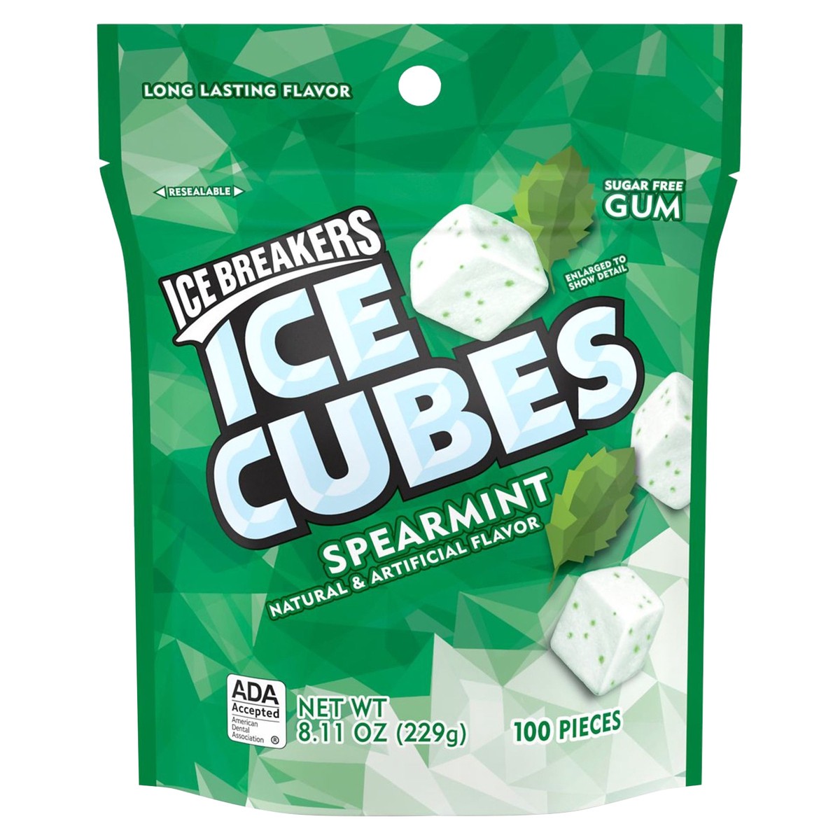- 100-count bag filled with Spearmint ICE BREAKERS ICE CUBES Sugar-Free Chewing Gum