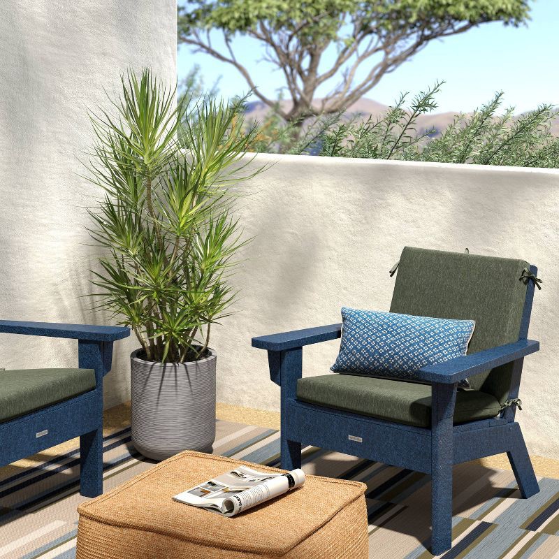 Add a soft charm to your seating space with this 1-Piece Solid Outdoor Chair Cushion from Threshold™. Made of 100% recycled polyester material with polyester filling for plush comfort, this chair seat…