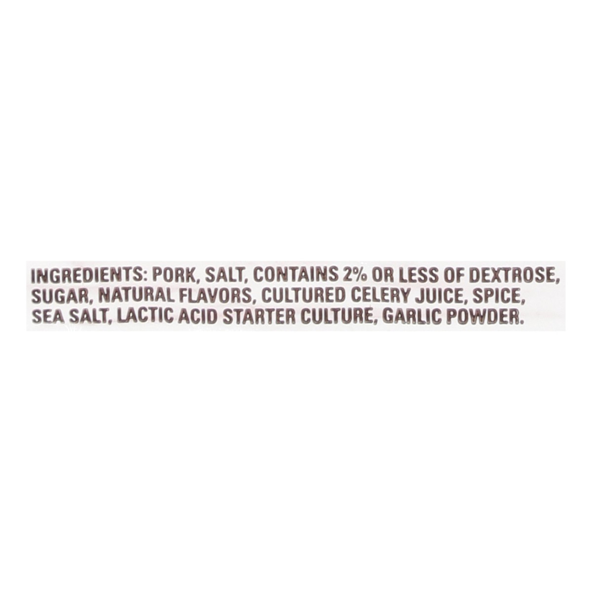 Pork, Salt, Contains 2% or Less of Dextrose, Sugar, Natural Flavors, Cultured Celery Juice, Spice, Sea Salt, Lactic Acid Starter Culture, Garlic Powder.