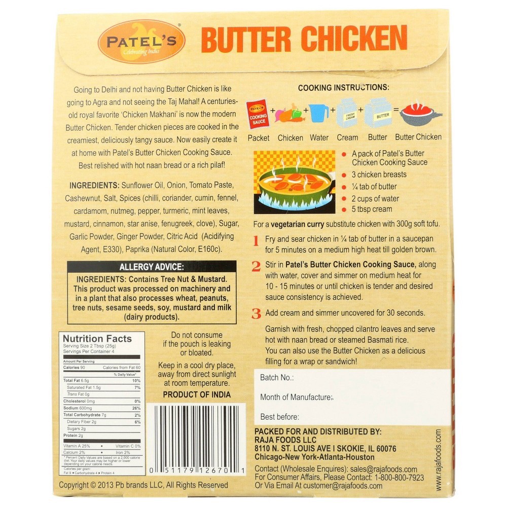Cooking sauce with roasted spices. Just add chicken & cream. Celebrating India. 100% vegetarian. Going to Delhi and not having Butter Chicken is like going to Agra and not seeing the Taj Mahal! A cent…