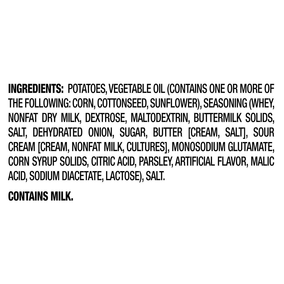 Potatoes, Vegetable Oil (Contains One or More of the Following: Corn, Cottonseed, Sunflower), Seasoning (Whey, Nonfat Dry Milk, Dextrose, Maltodextrin, Buttermilk Solids, Salt, Dehydrated Onion, Sugar…