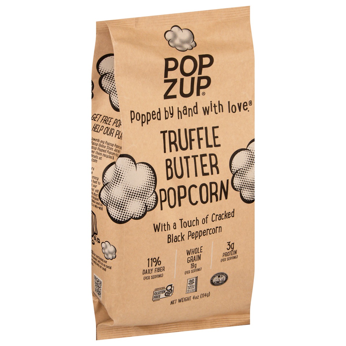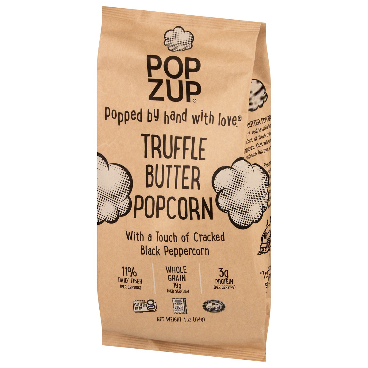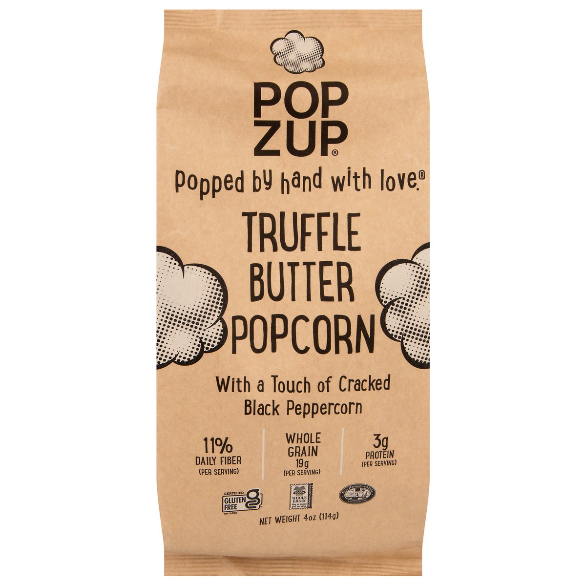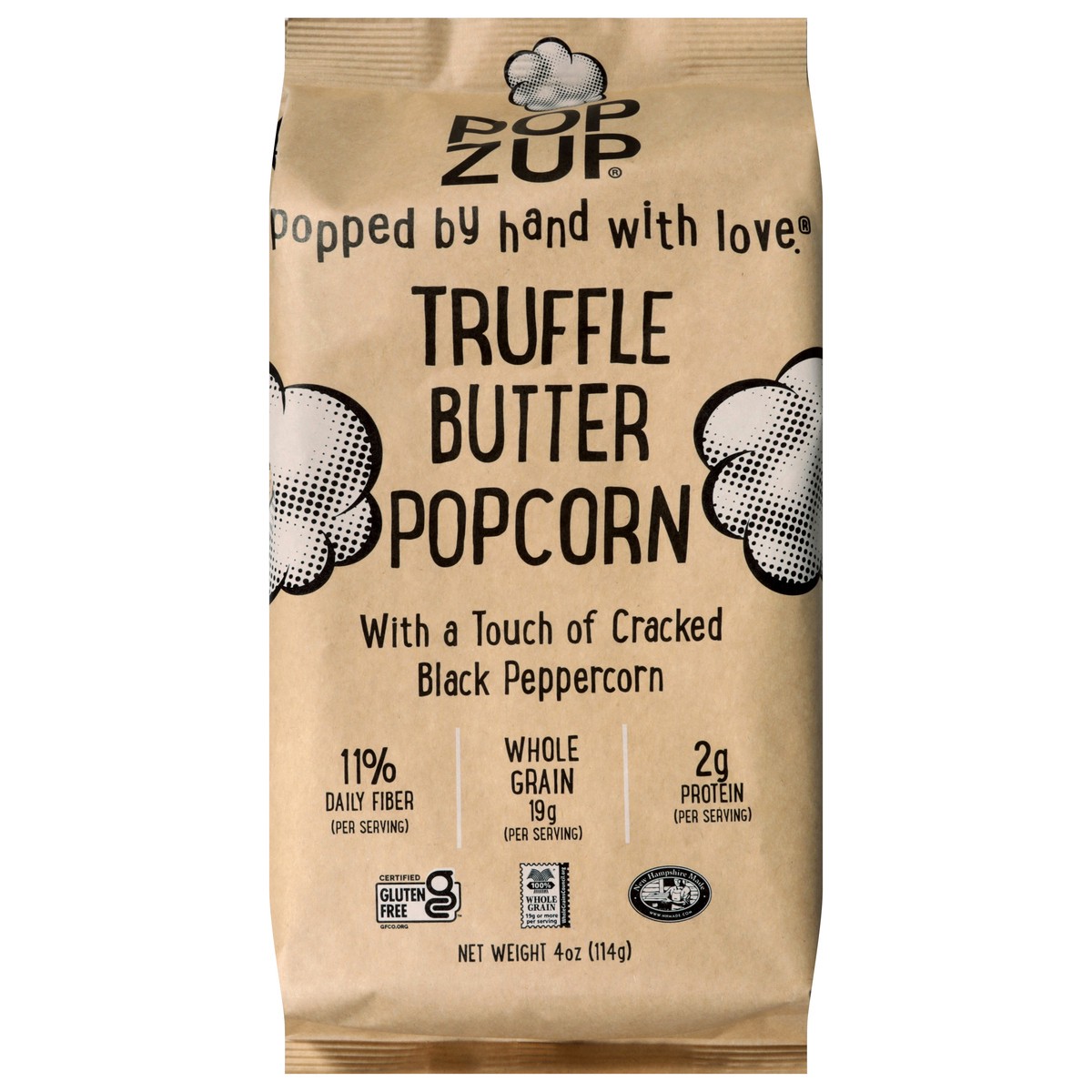 Popzup Popcorn is popped in small batched by hand with pure, simple ingredients like pure sweet cream butter infused with real black truffles, fresh cracked black peppercorn, turmeric, and sea salt.