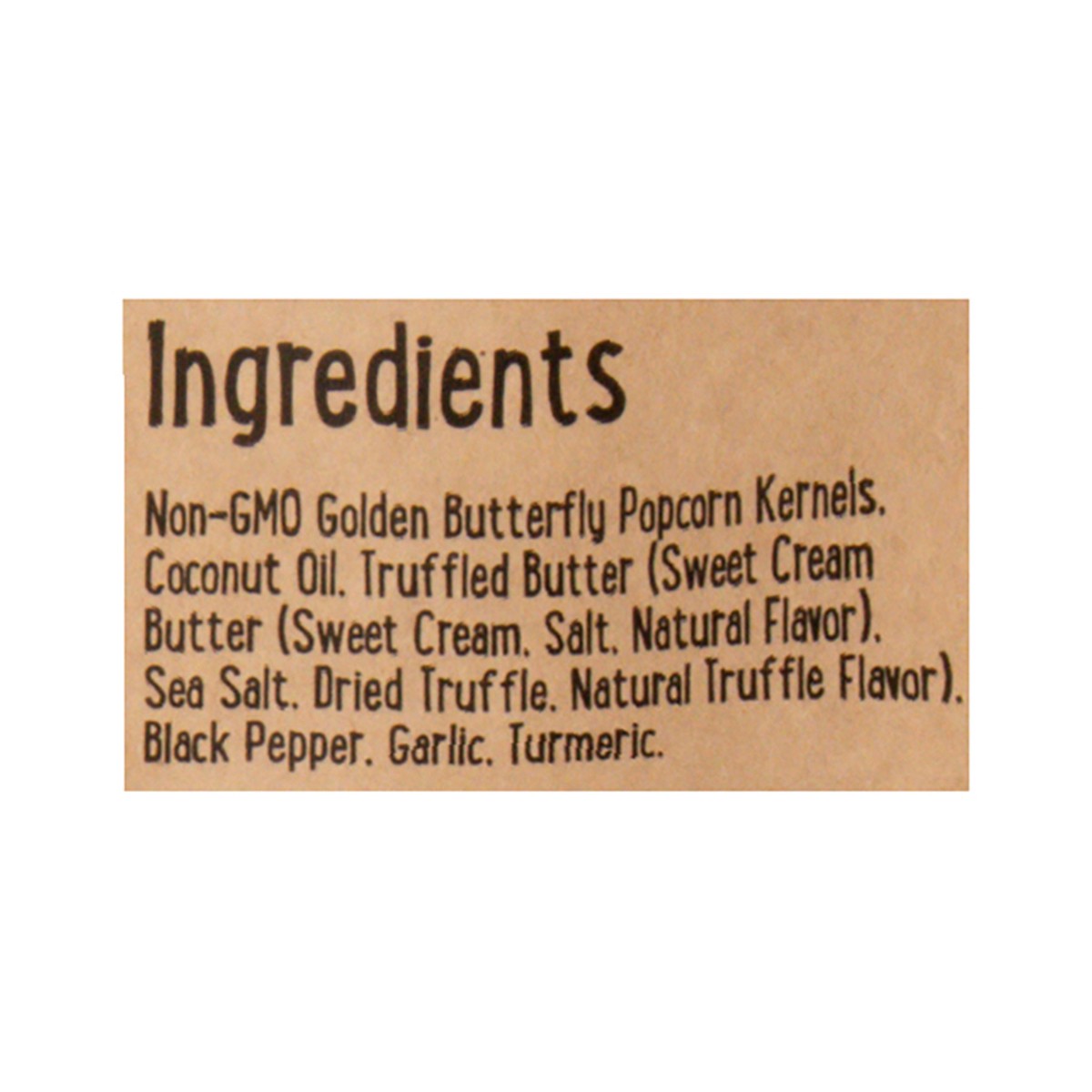 Non-GMO Golden Butterfly Popcorn Kernels. Coconut Oil. Truffled Butter (Sweet Cream Butter (Sweet Cream, Salt, Natural Flavor). Sea Salt. Dried Truffle. Natural Truffle Flavor). Black Pepper. Garlic. …