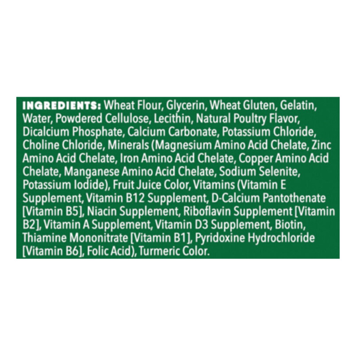 Wheat Flour\, Glycerin\, Wheat Gluten\, Gelatin\, Water\, Powdered Cellulose\, Lecithin\, Natural Poultry Flavor\, Dicalcium Phosphate\, Calcium Carbonate\, Potassium Chloride\, Choline Chloride\, Min…