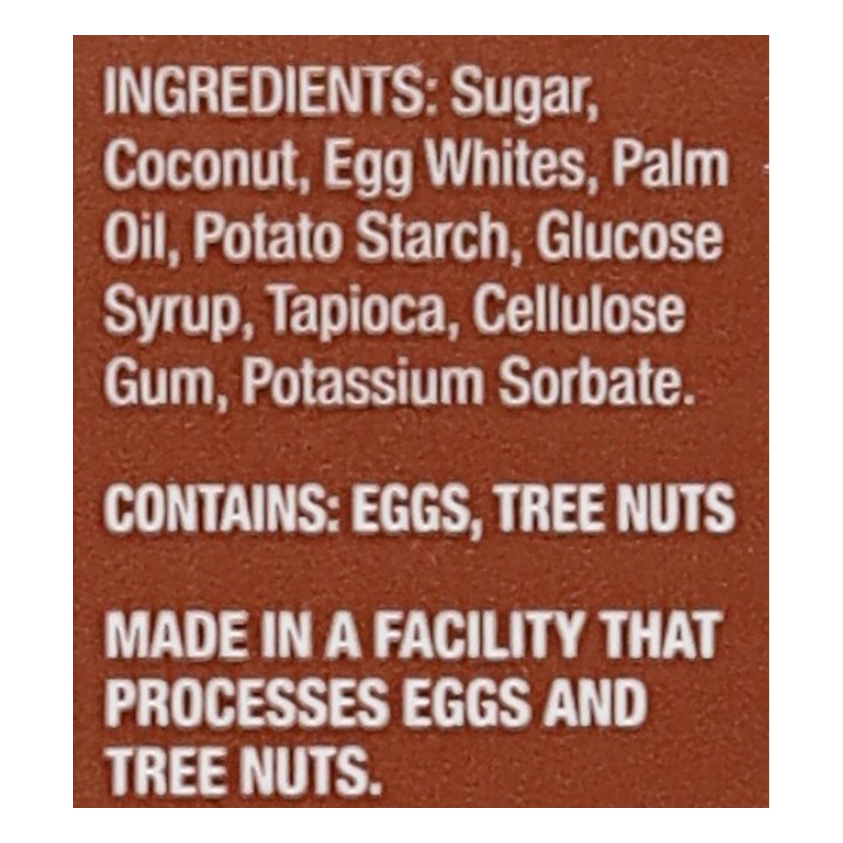Sugar, Coconut, Egg Whites, Palm Oil, Potato Starch, Glucose Syrup, Tapioca, Cellulose Gum, Potassium Sorbate.