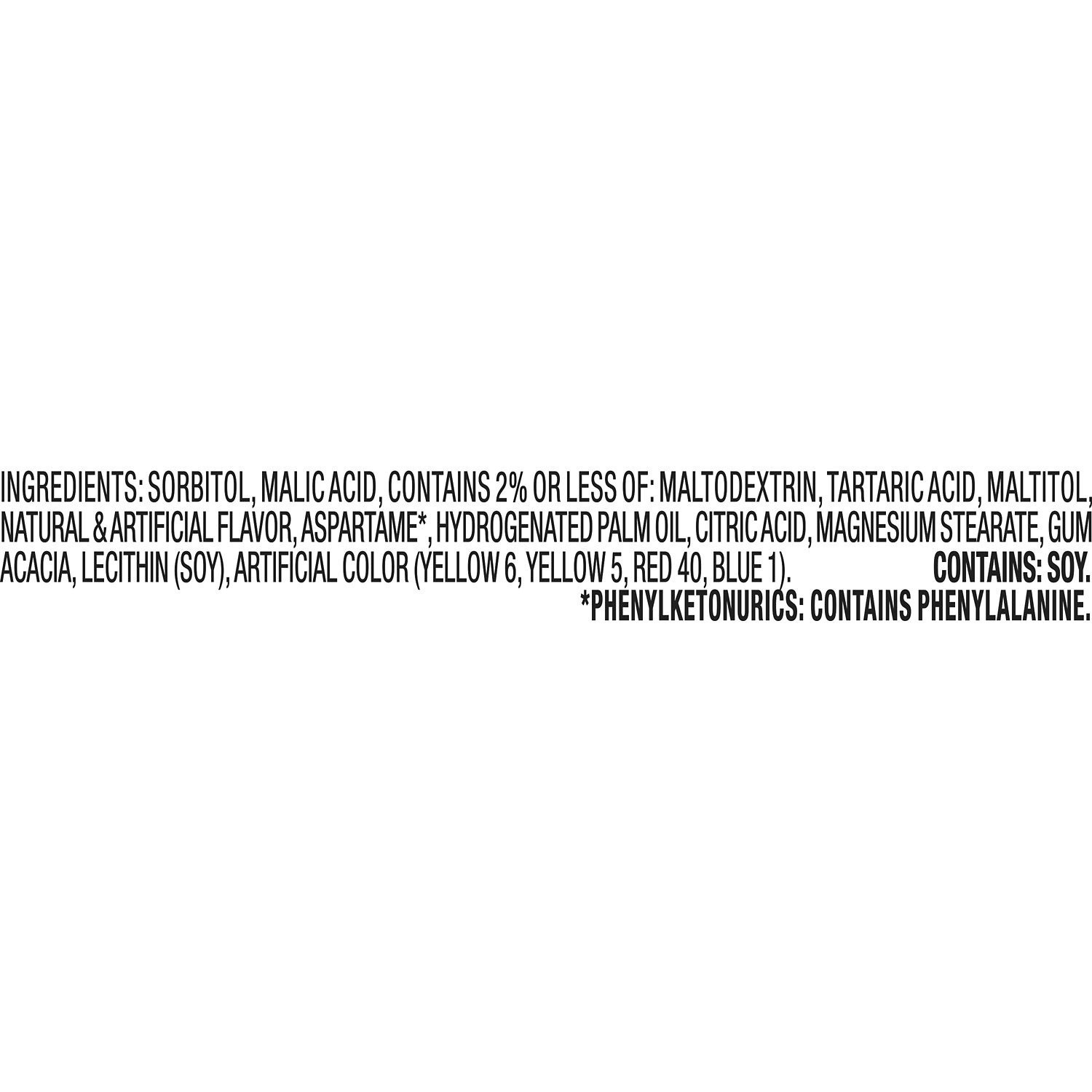 SORBITOL, MALIC ACID, CONTAINS 2% OR LESS OF: MALTODEXTRIN, TARTARIC ACID, MALTITOL, NATURAL & ARTIFICIAL FLAVOR, ASPARTAME*, HYDROGENATED PALM OIL, CITRIC ACID, MAGNESIUM STEARATE, GUM ACACIA, LE…