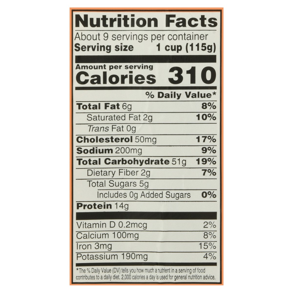 Per 1 Cup: 310 calories; 2 g sat fat (10% DV); 200 mg sodium (9% DV); 5 g total sugars. Cook thoroughly. Cook in 5-7 minutes. 100% satisfaction guaranteed. Our quality commitment. If not 100% satisfie…