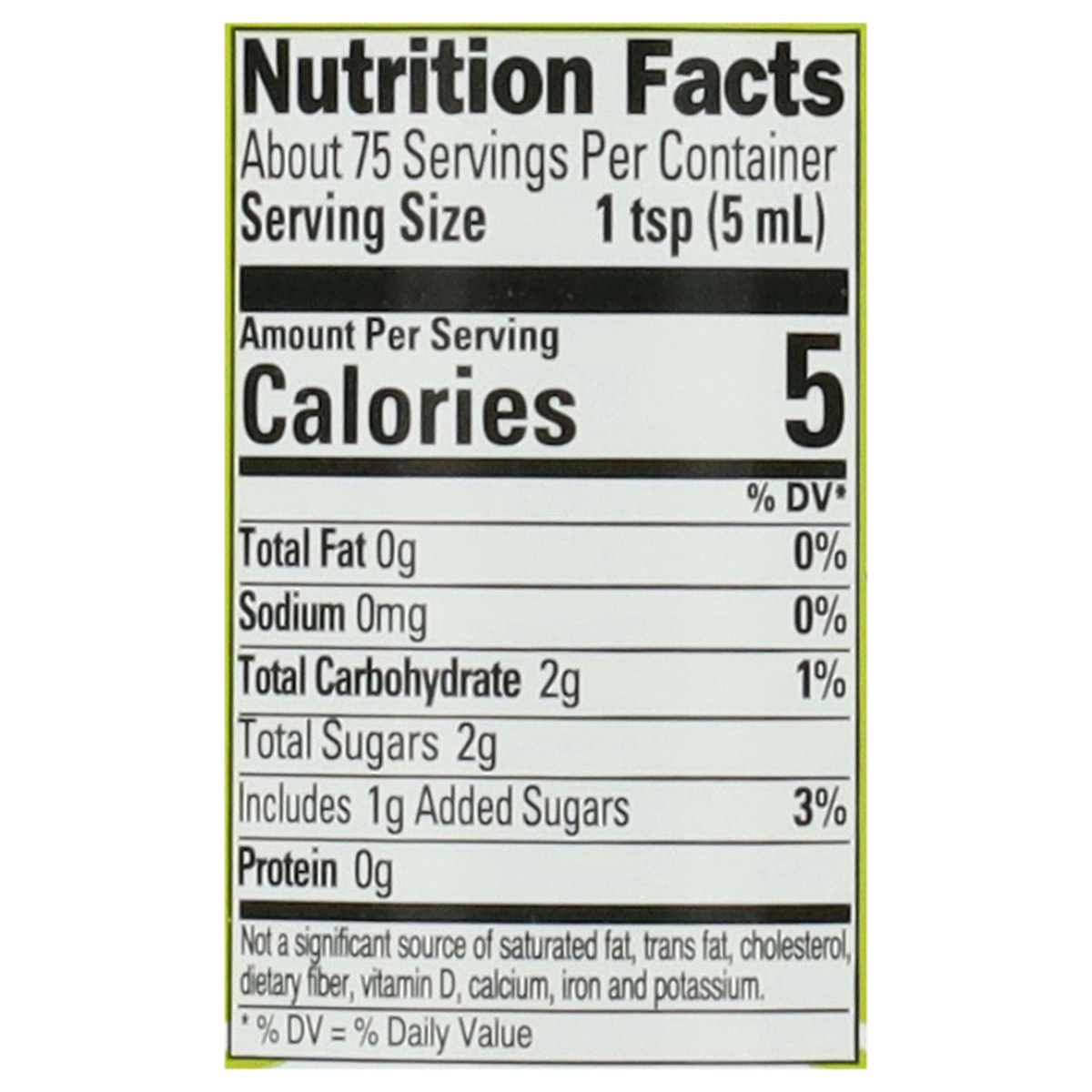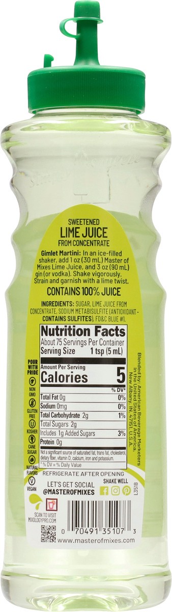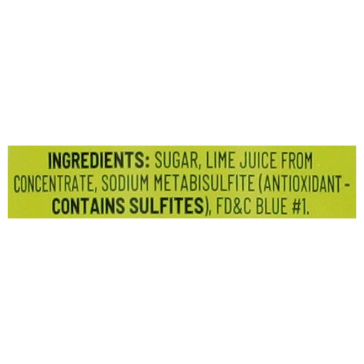Reconstituted Lime Juice (Lime Juice from Concentrate and Water), High Fructose Corn Syrup, Sodium Metabisulfite, FD&C Blue 1.